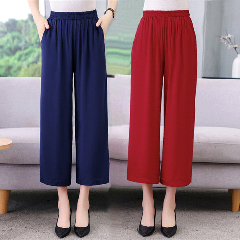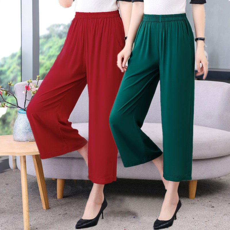中老年女裤夏季棉绸八分裤直筒宽松大码松紧妈妈装高腰薄款七分裤