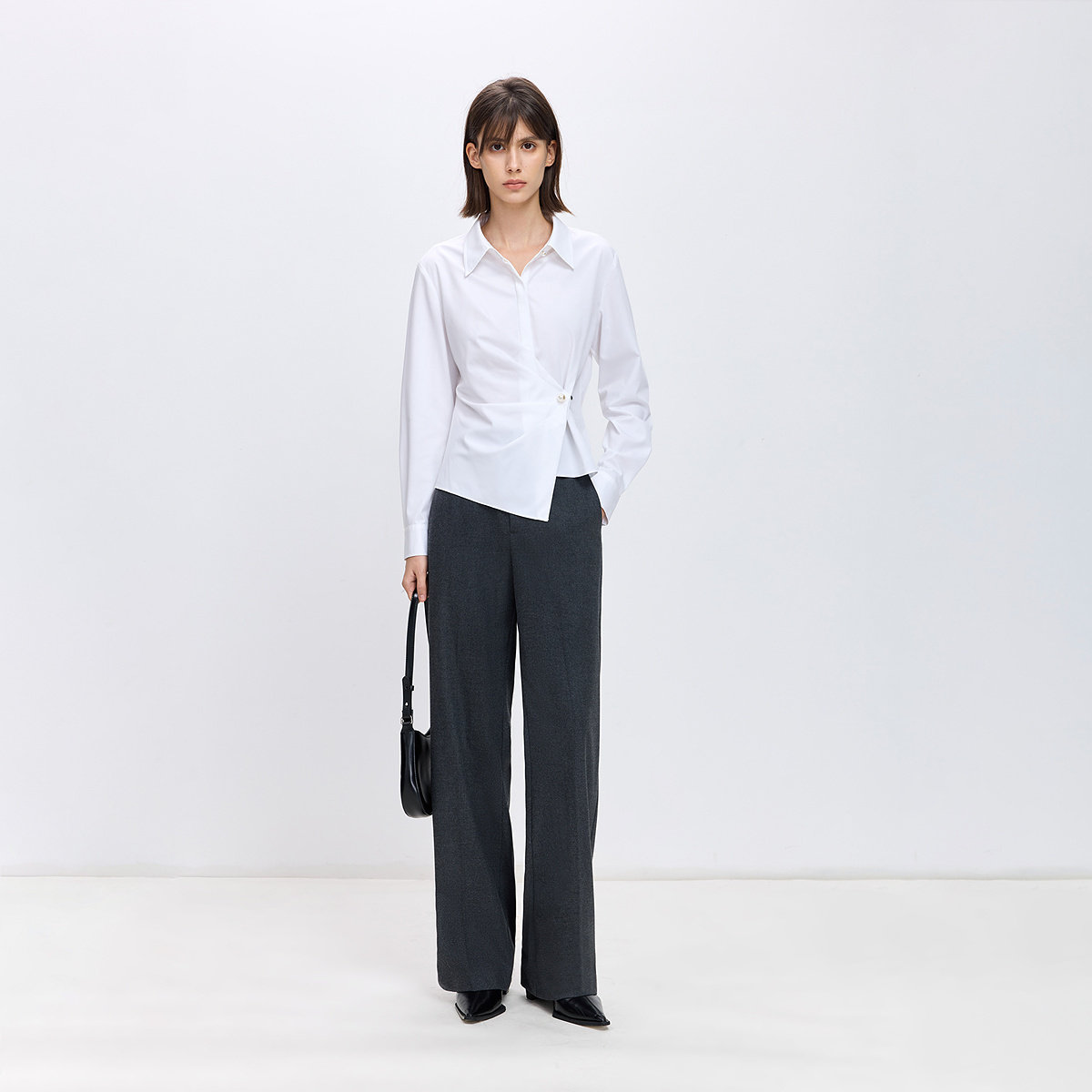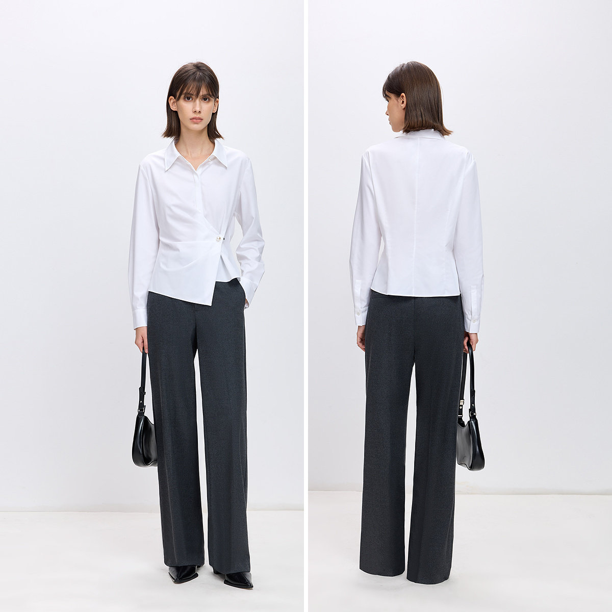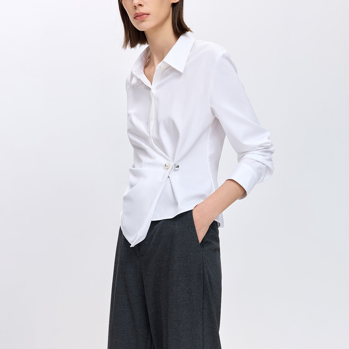 LILY2026春新款女装设计感翻领褶皱收腰气质通勤长袖白色衬衫短款