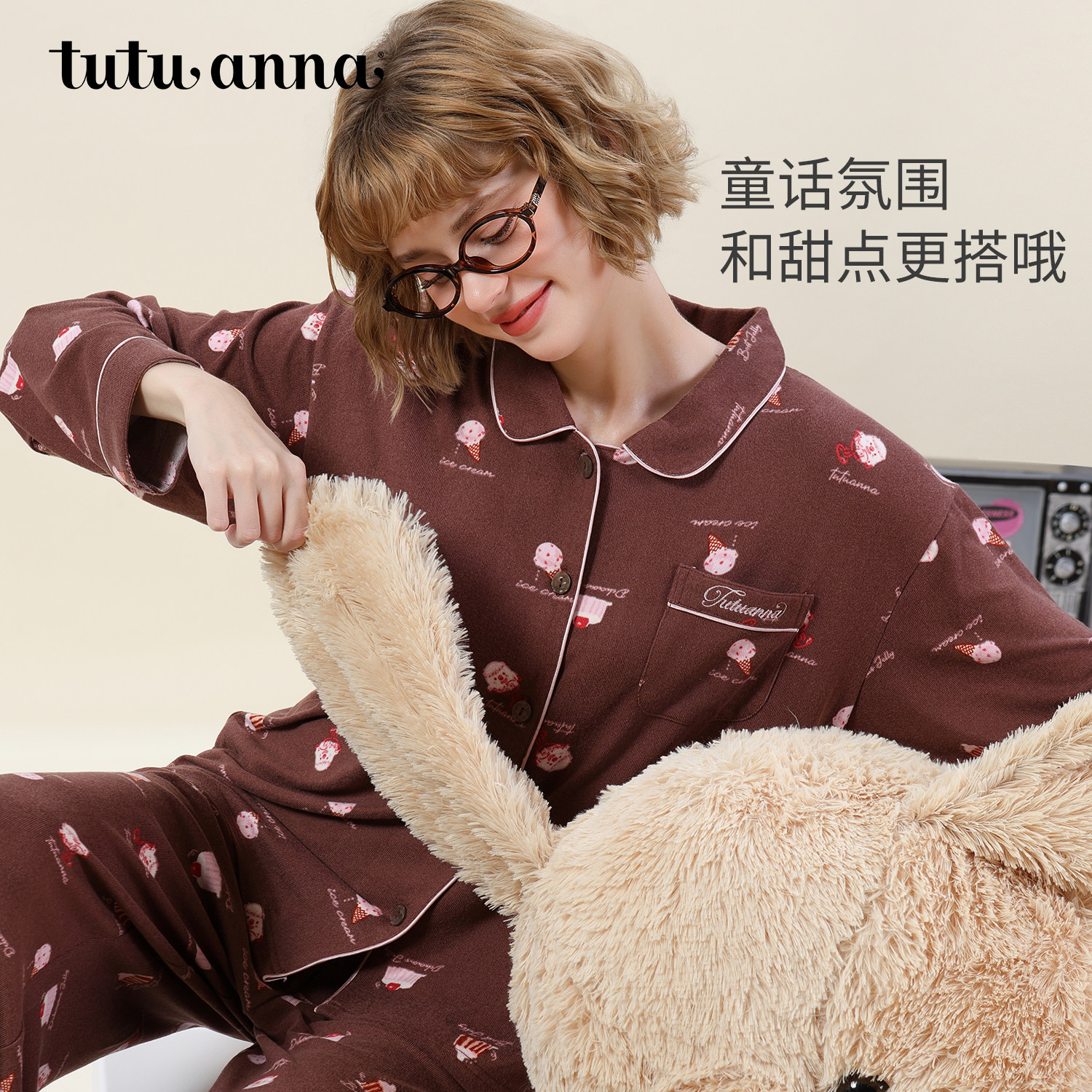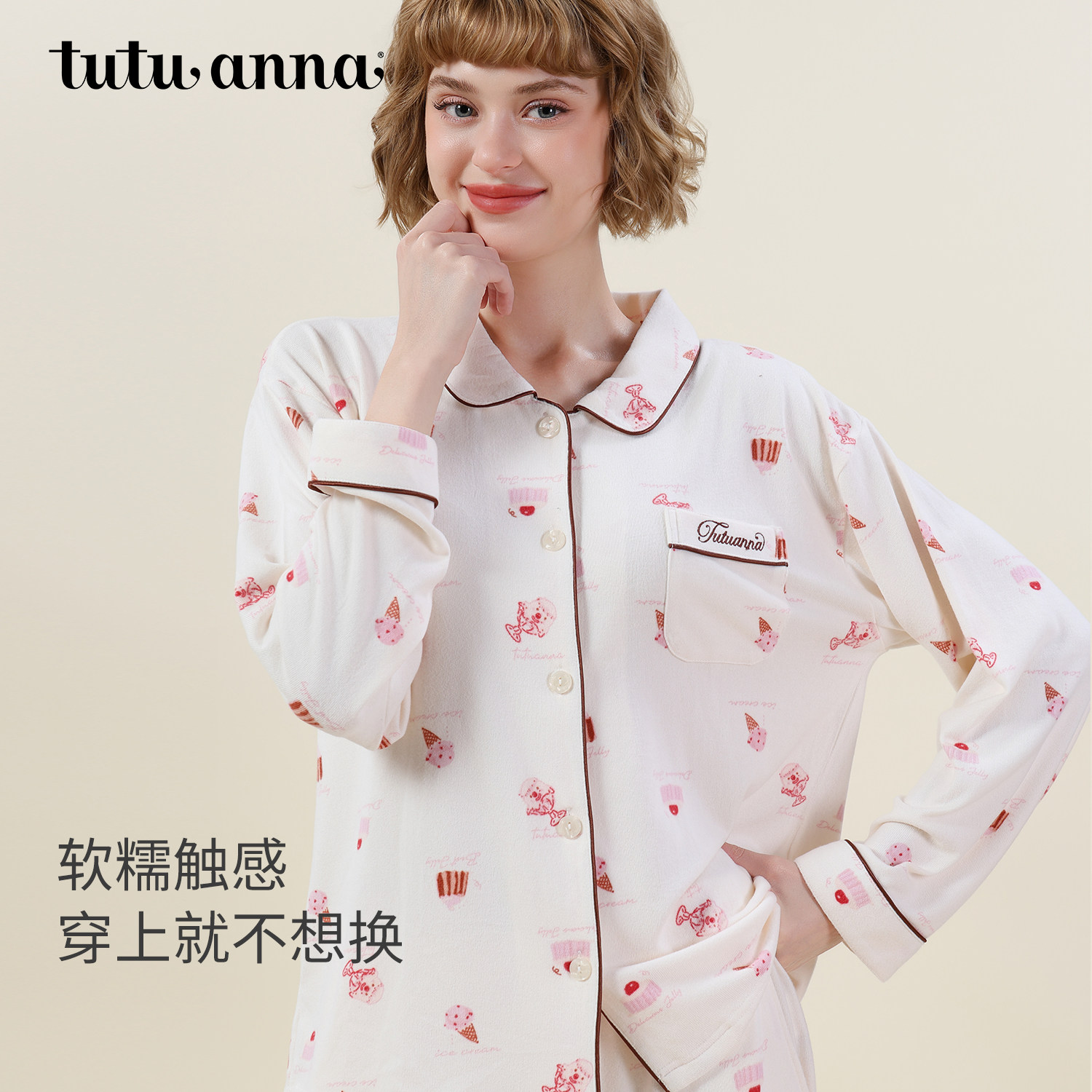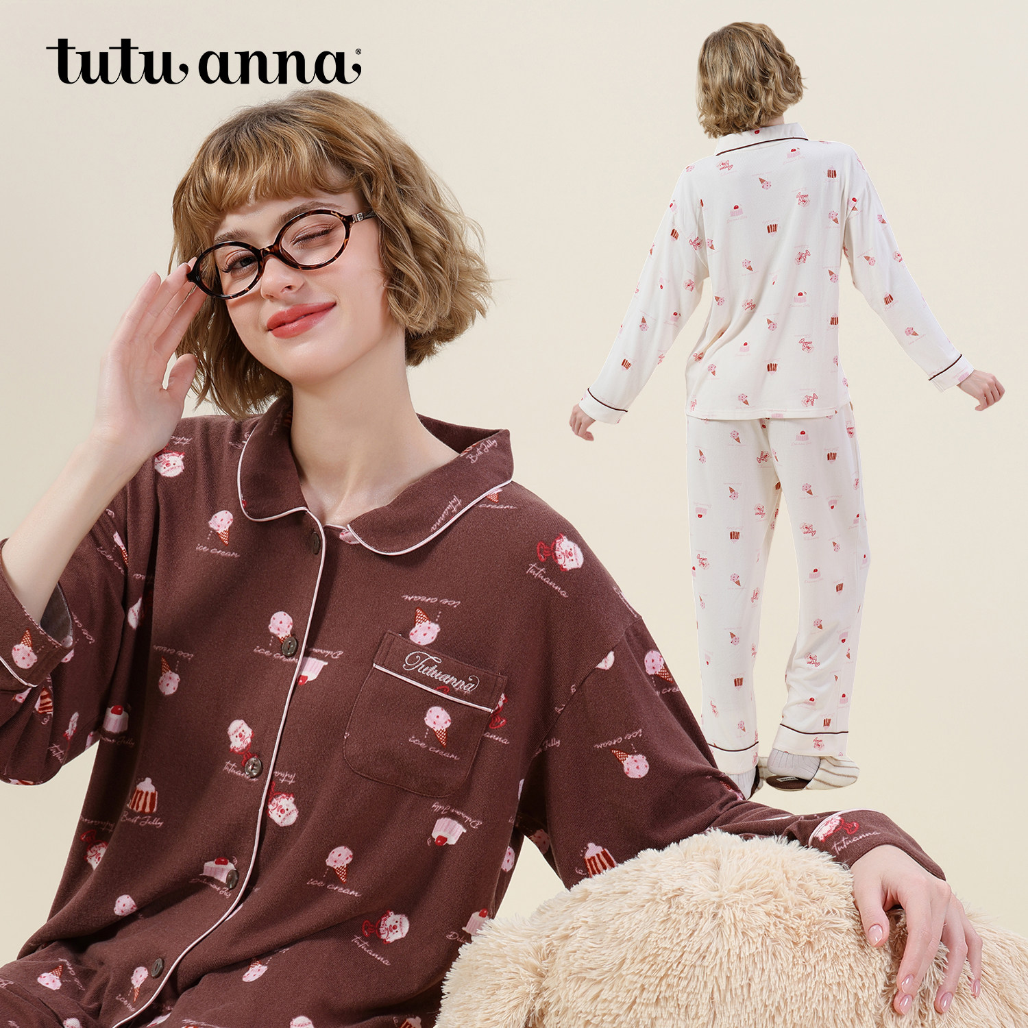 tutuanna秋冬女士睡衣 超柔面料蛋糕满印前扣长袖长裤家居服套装