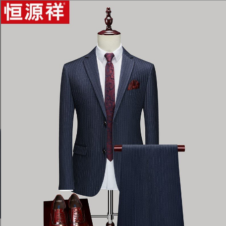 恒源祥品牌男西服男西装套装休闲条纹伴郎服新郎结婚礼服两件套