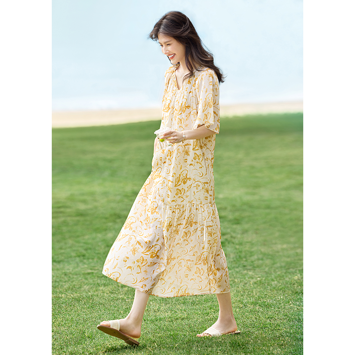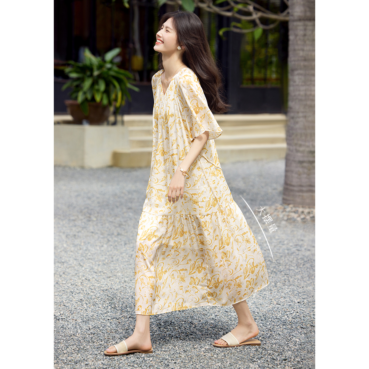 XWI欣未浪漫法式印花雪纺连衣裙女2025夏季鸡心领收腰显瘦仙女裙
