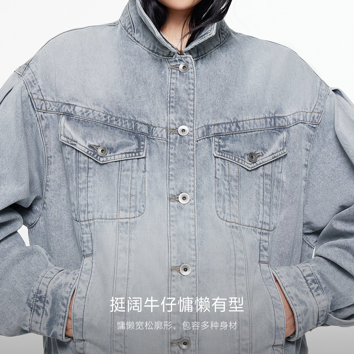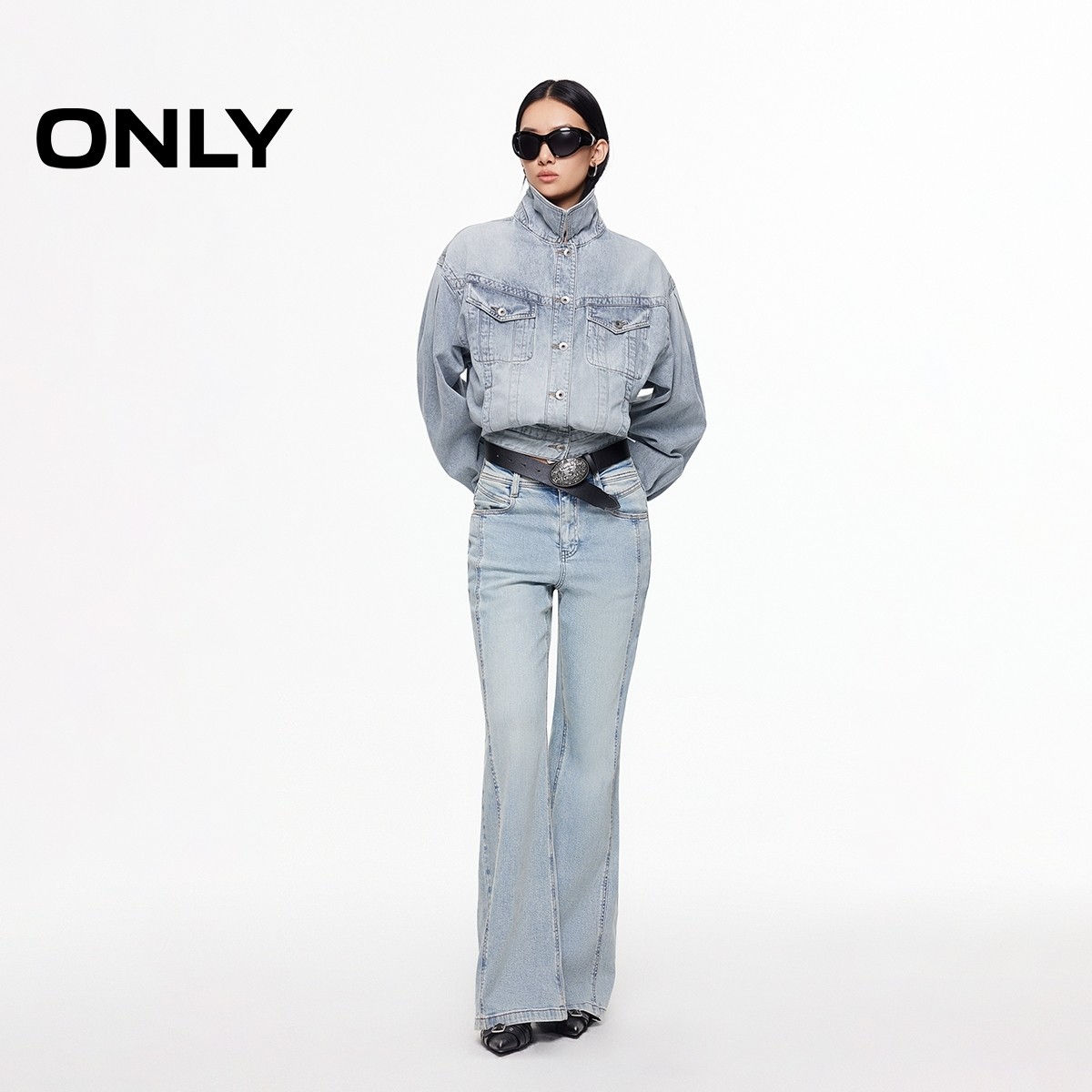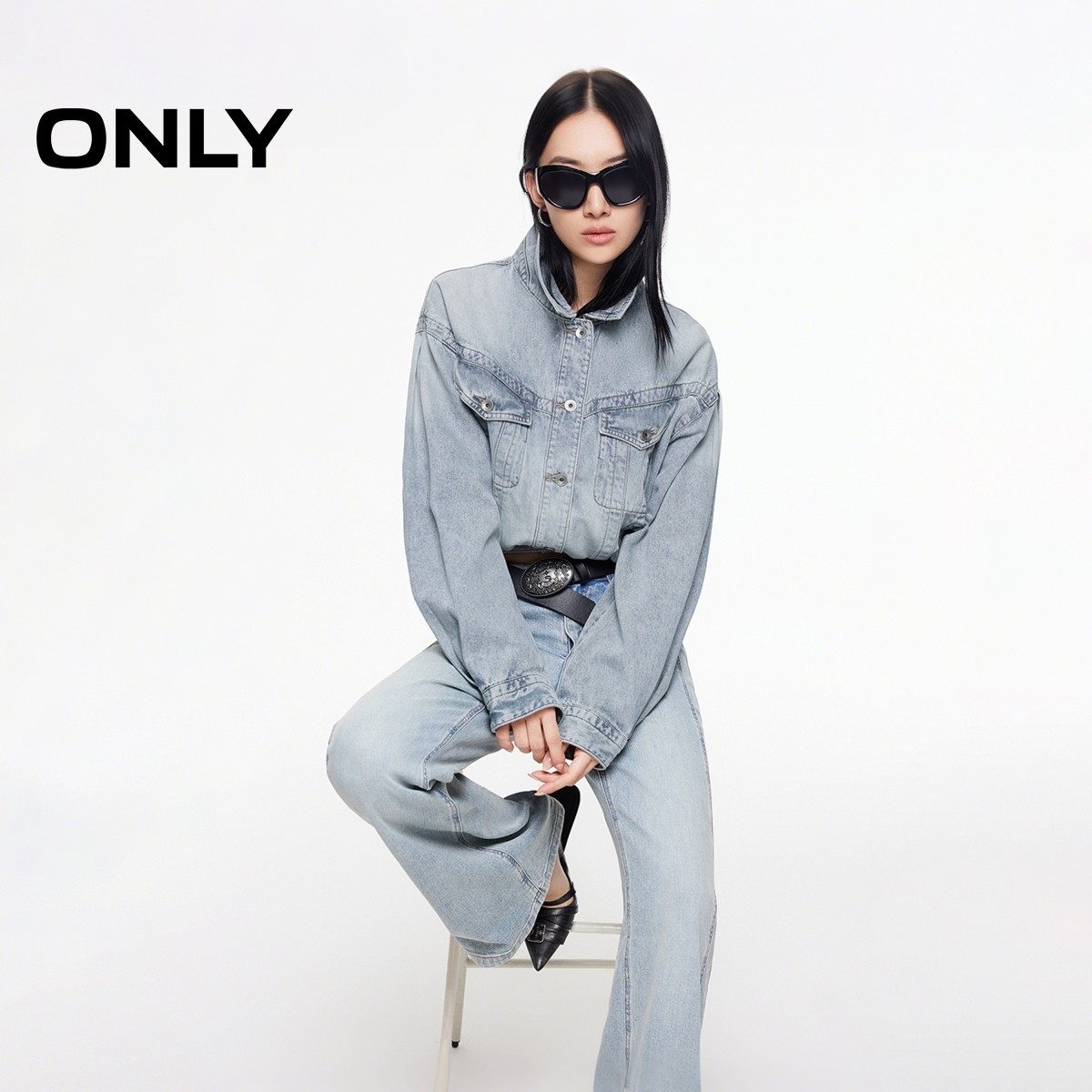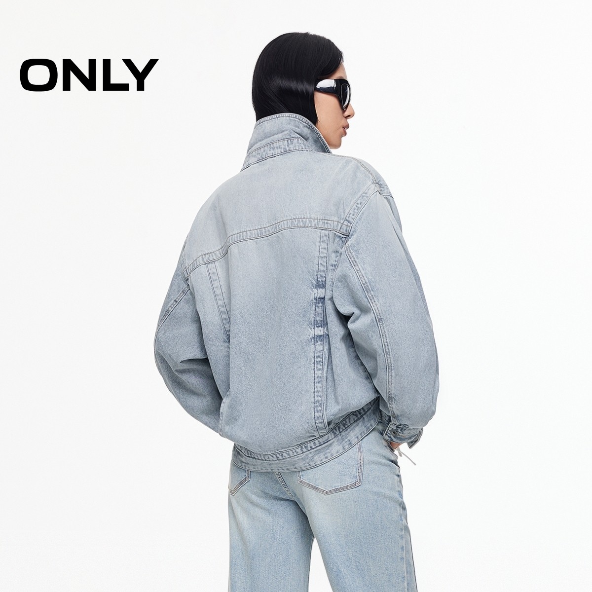 ONLY2025冬季新款街头酷感复古磨白水洗浅蓝色做旧牛仔外套女