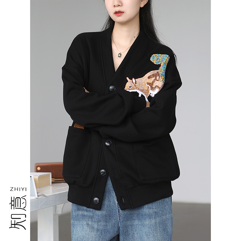 知意大码宽松重工小松鼠刺绣加厚卫衣开衫女2025百搭休闲外套