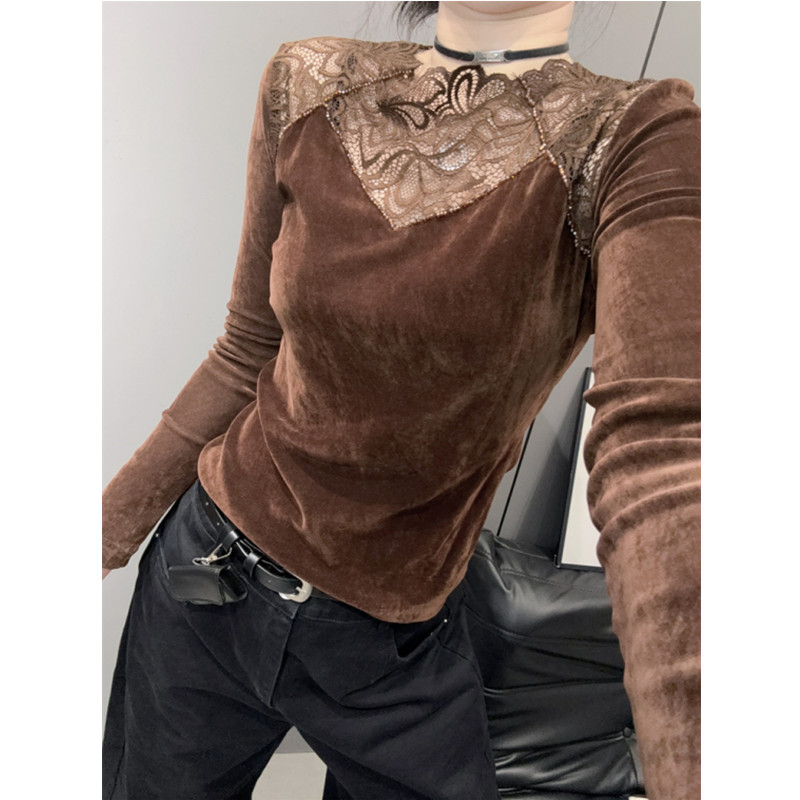 性感蕾丝镂空T恤长袖女拼接丝绒气质百搭紧身打底衫微透上衣秋冬