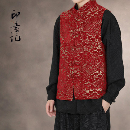 秋新款中国风无袖新中式立领马甲男红色盘扣宽松休闲坎肩提花马甲