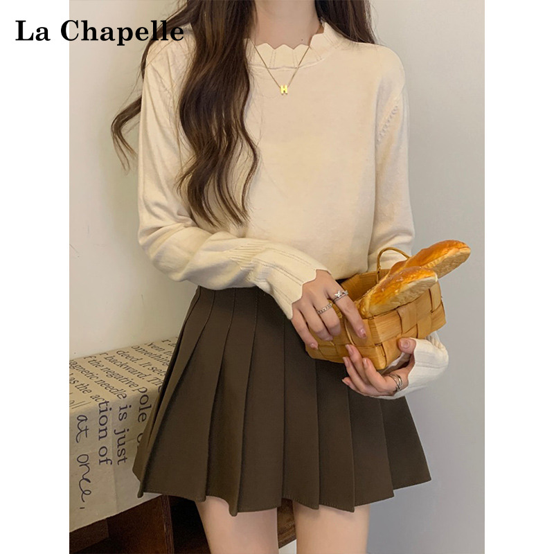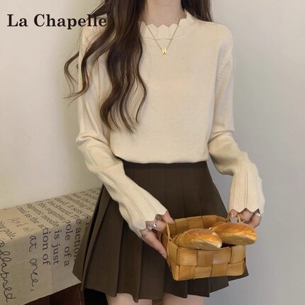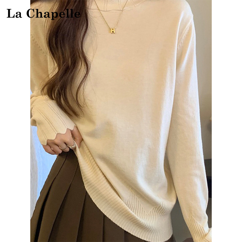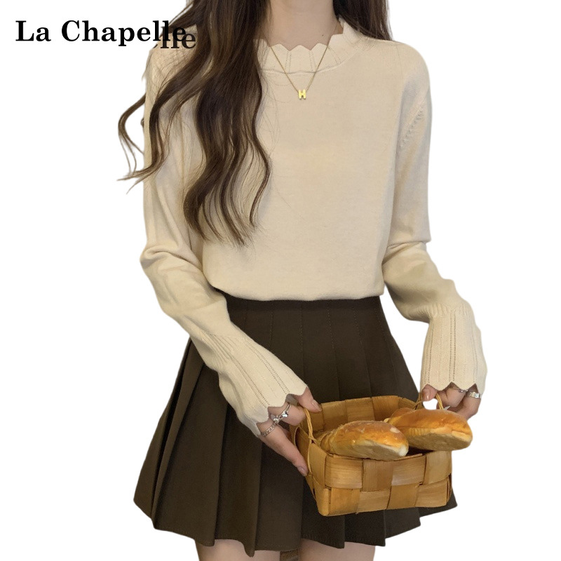 拉夏贝尔法式圆领针织打底衫女秋冬木耳边长袖T恤小香风内搭上衣