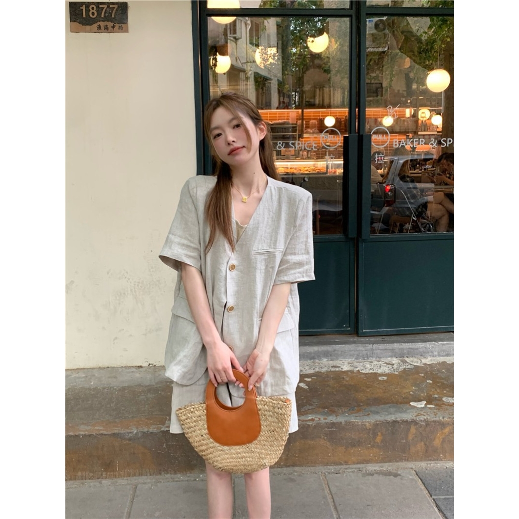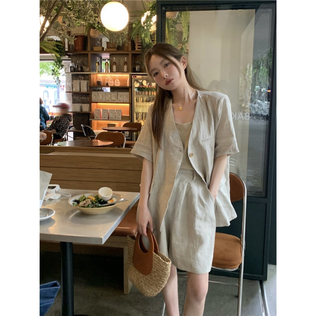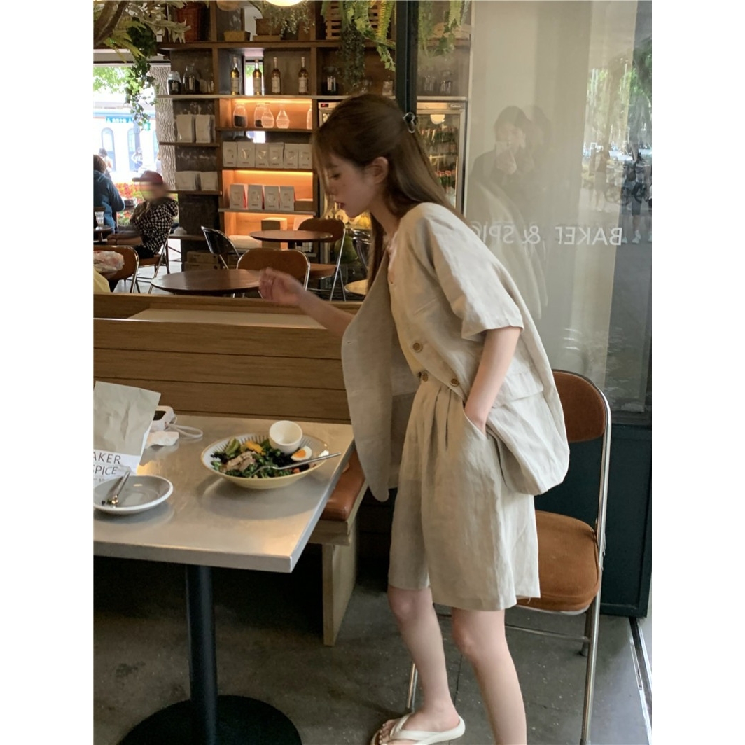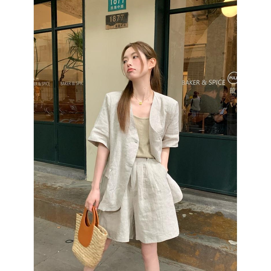 慵懒风时尚套装女装夏季2025新款短袖西装外套显瘦阔腿短裤两件套