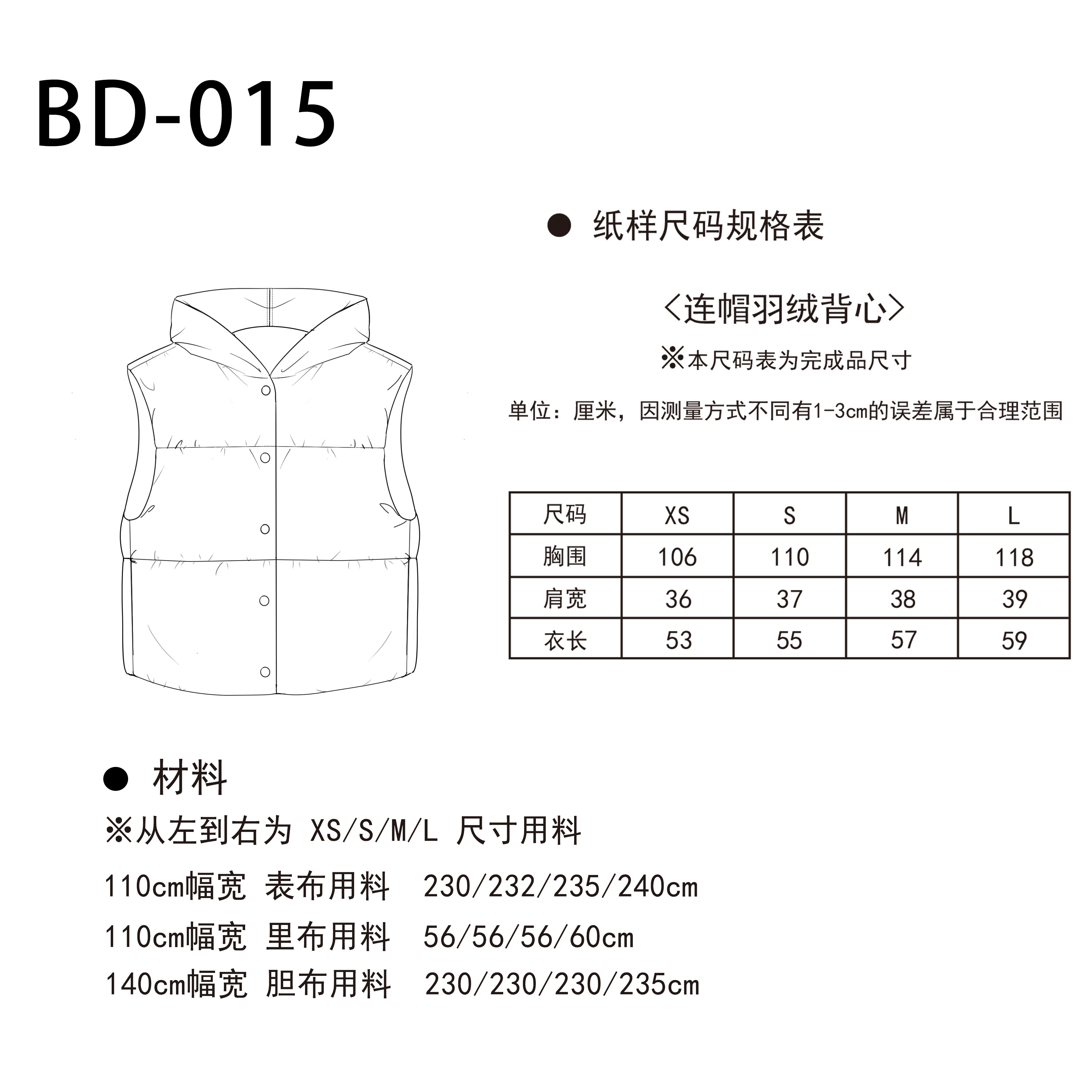 布懂时光自主打版图样DIY连帽羽绒背心保暖手工制作1:1纸样BD-015