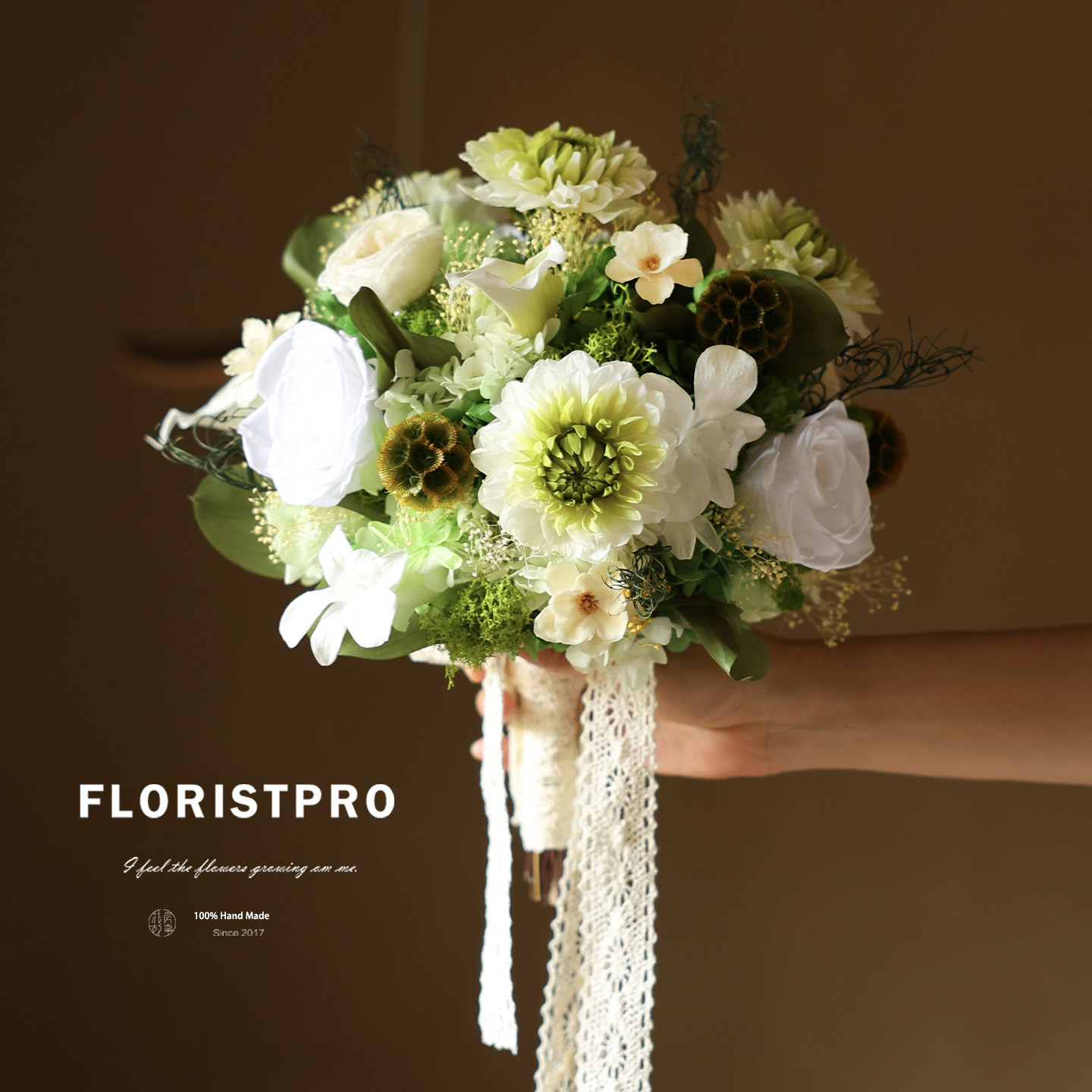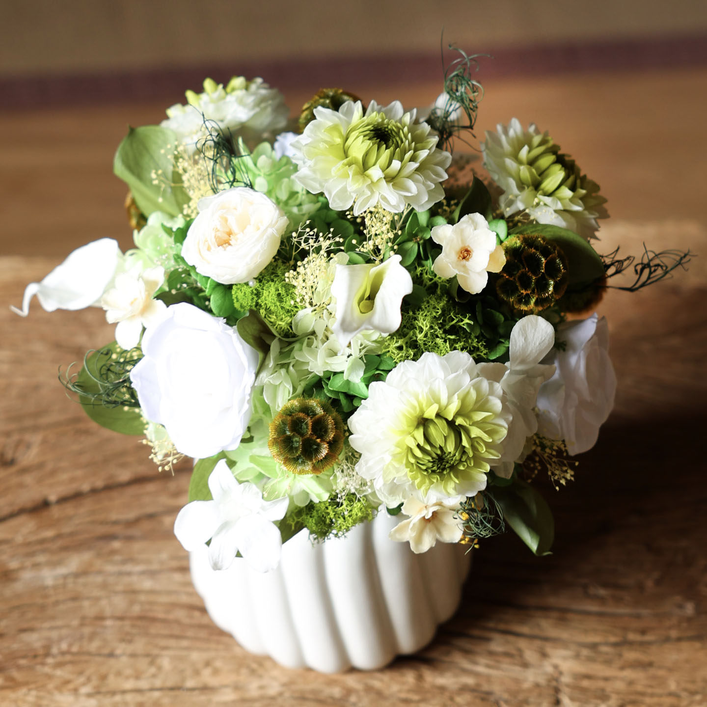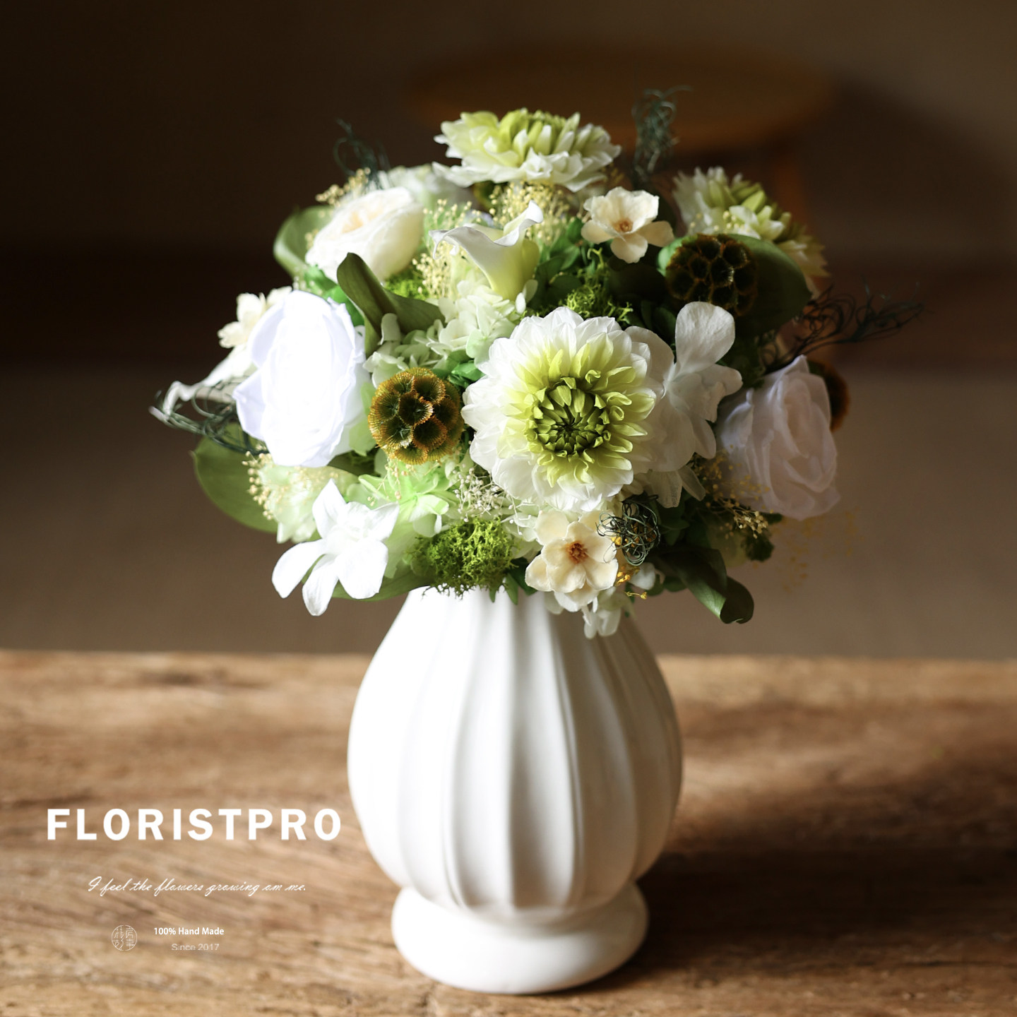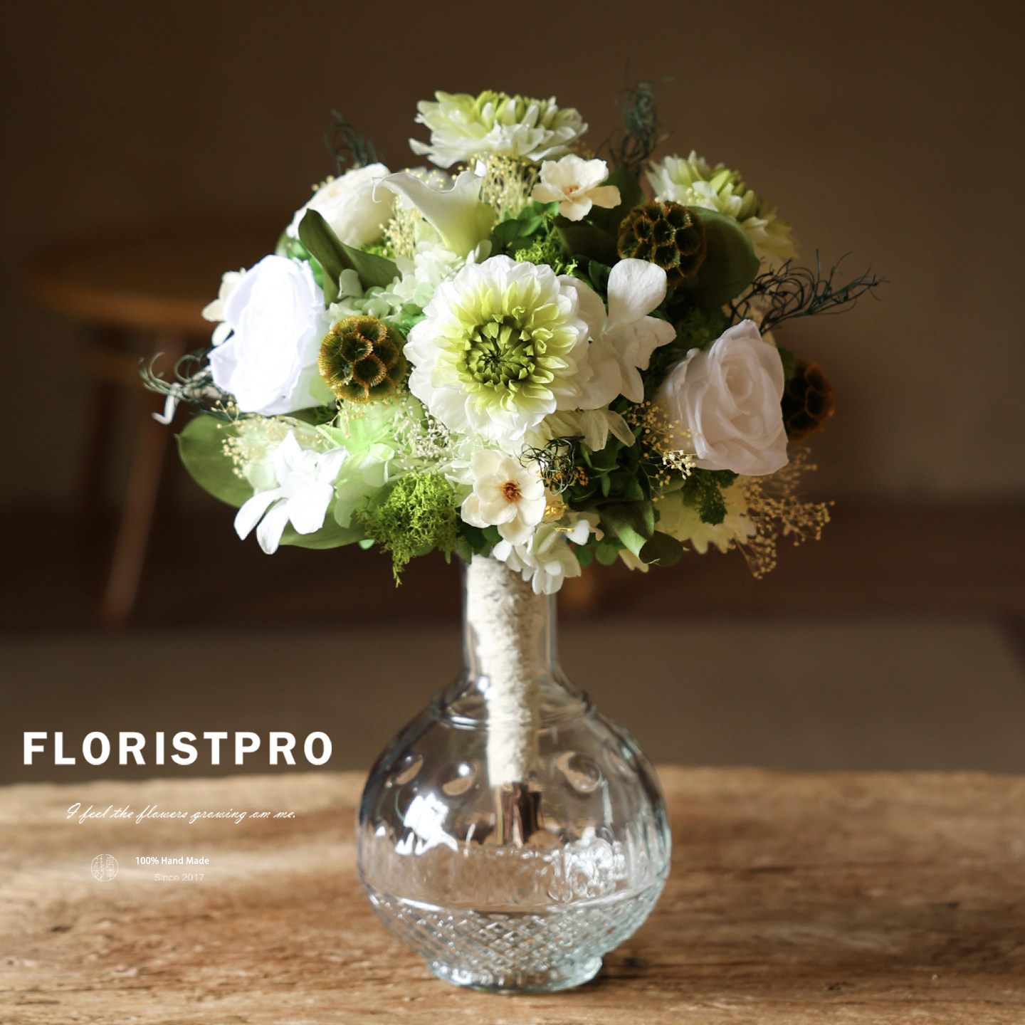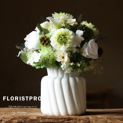 大丽花马蹄莲奥斯汀玫瑰永生花束