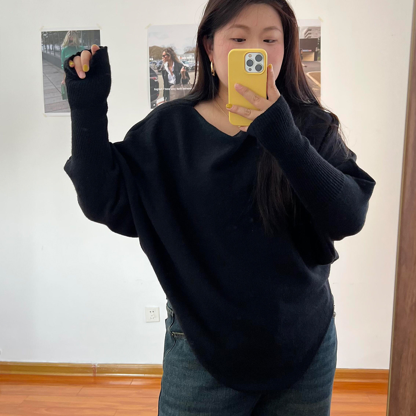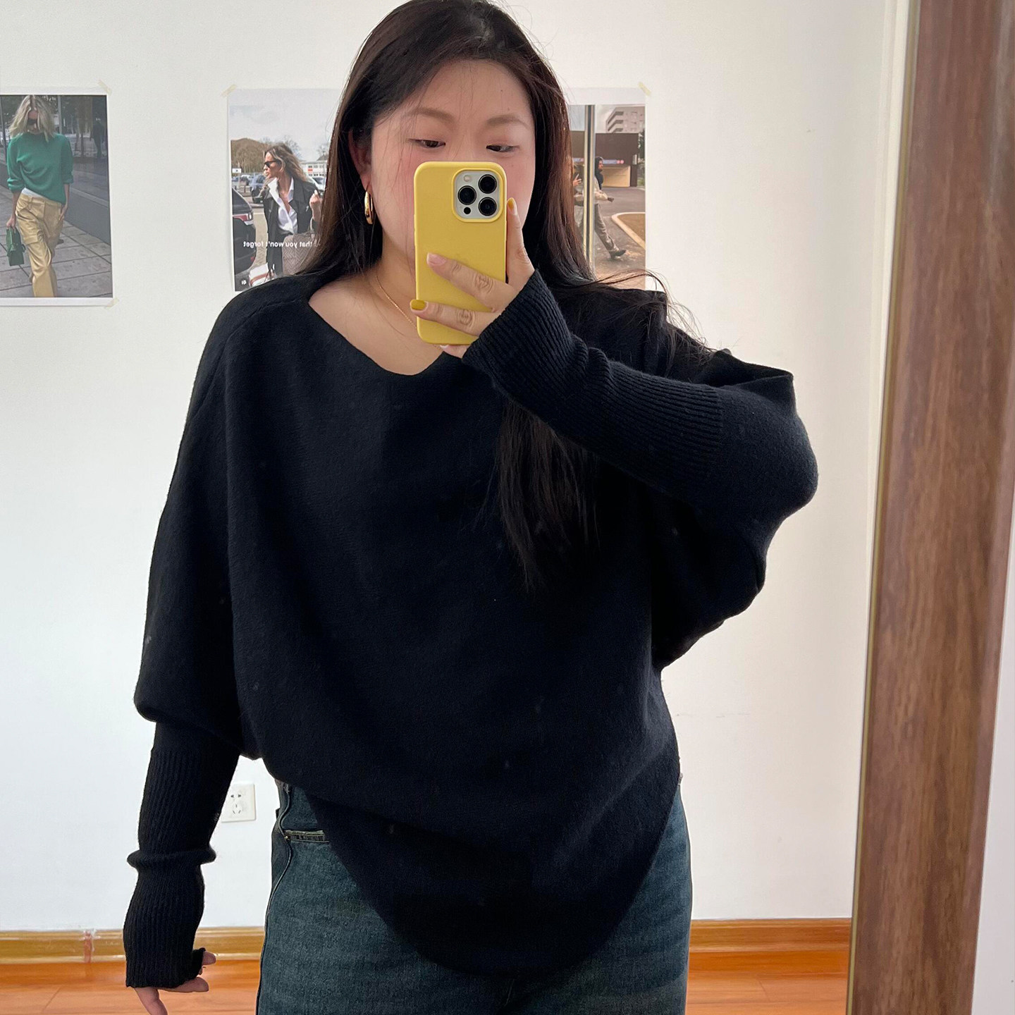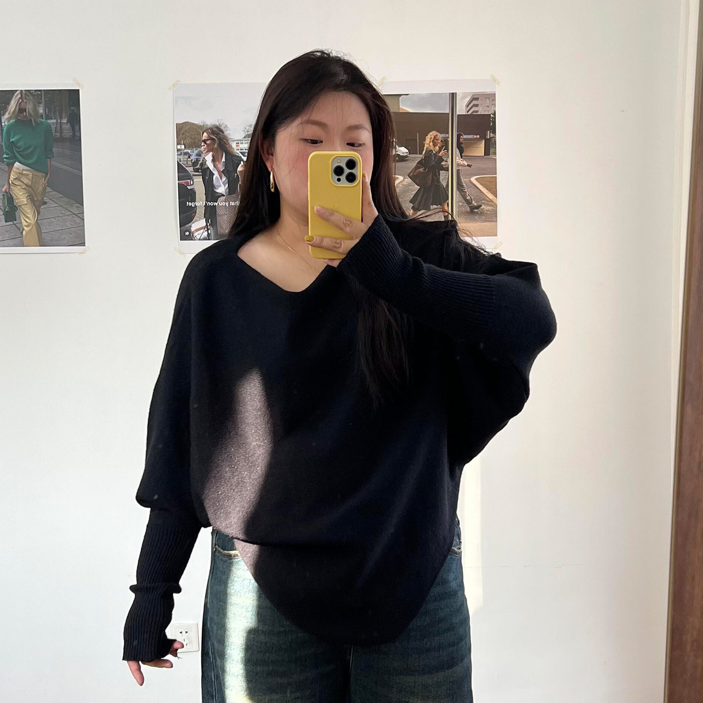 300斤胖mm大码秋冬黑色圆领长袖针织衫女宽松蝙蝠袖不规则上衣潮