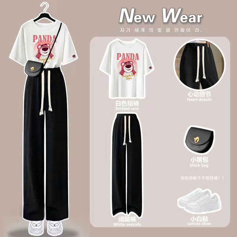 夏季纯棉短袖t恤女生套装韩版宽松设计感小众休闲裤牛仔裤一整套