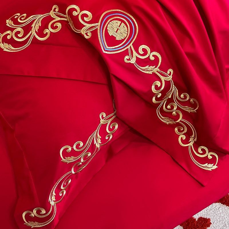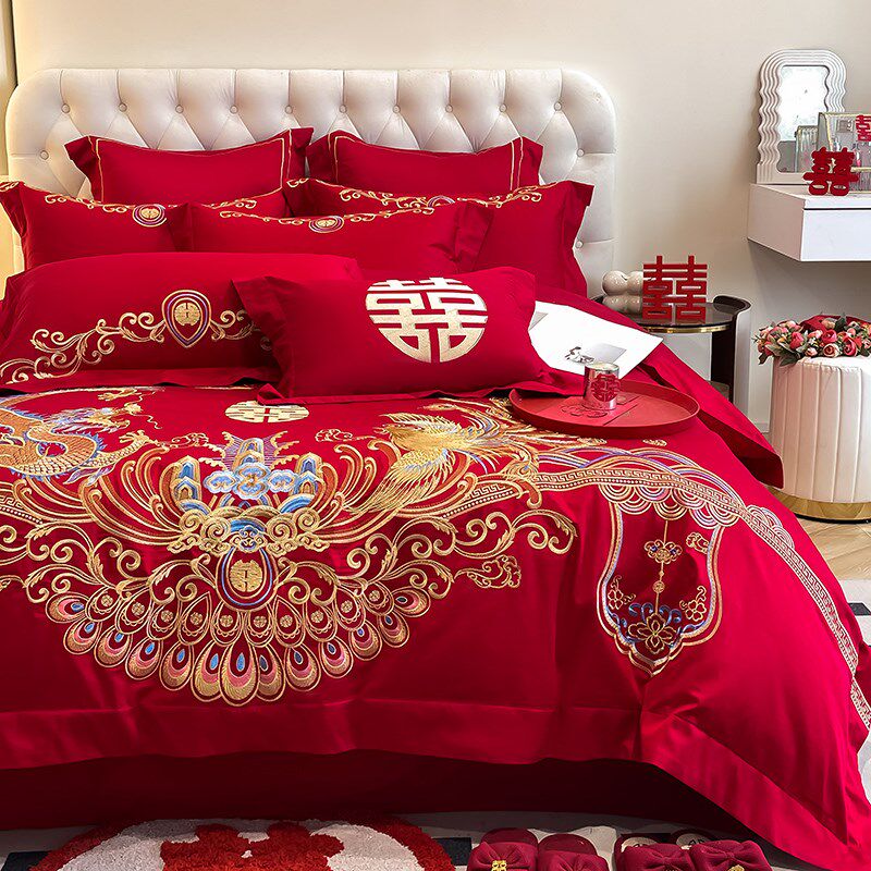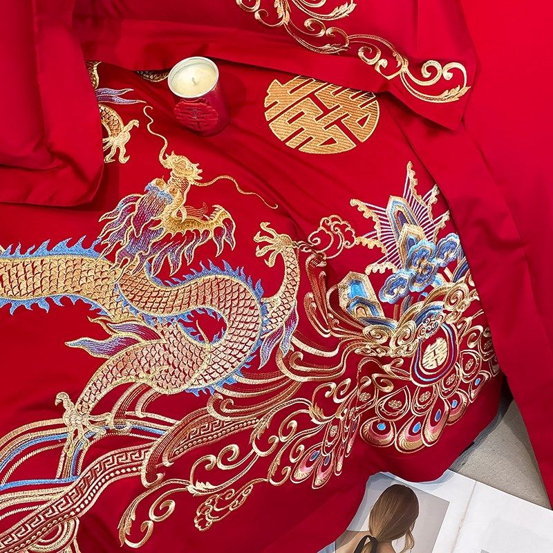 新中式180支长绒棉结婚四件套红色龙凤被套床单婚庆床上用品4
