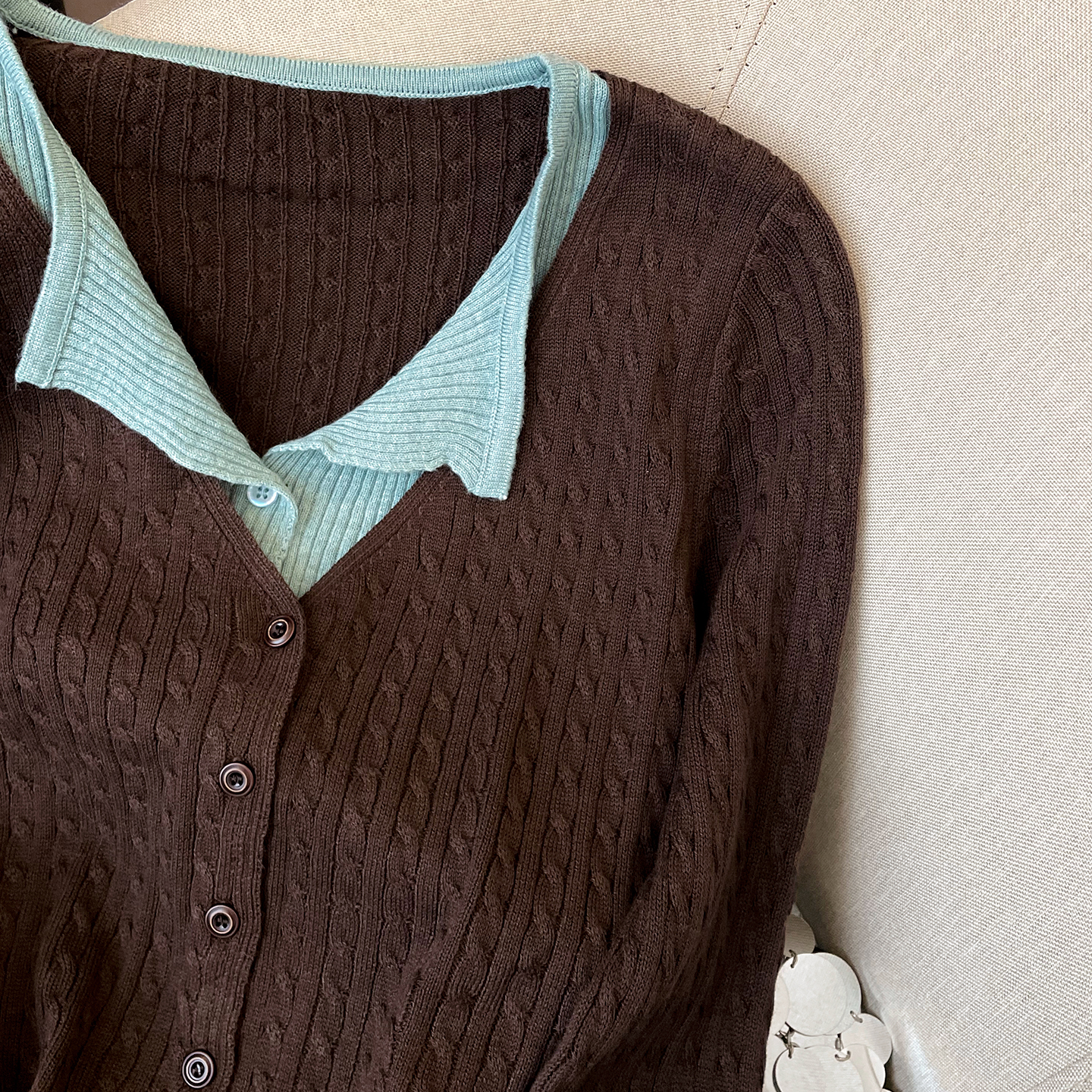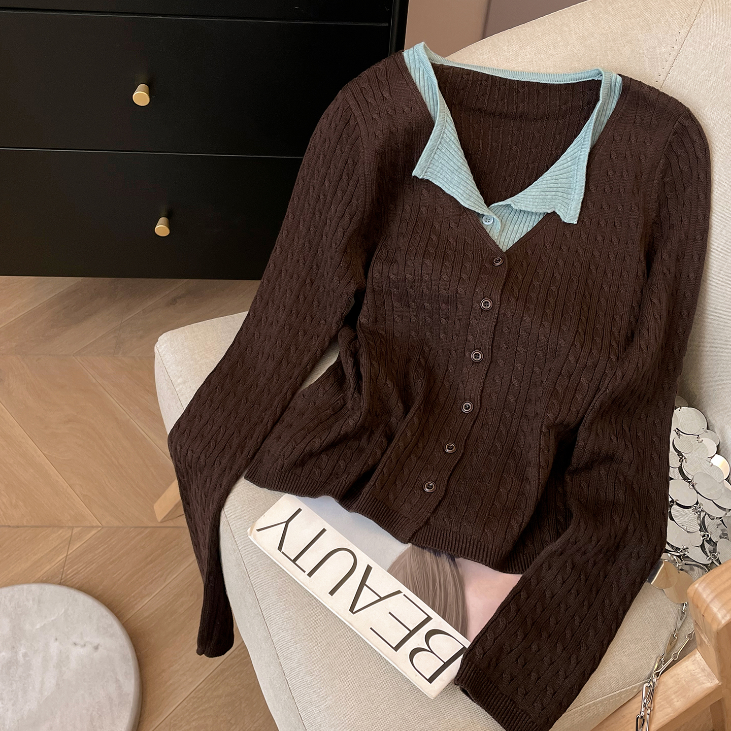 小C家 假两件拼色麻花针织开衫外套女2025新款秋季坑条纹翻领上衣