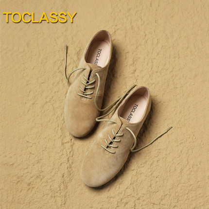 驼色 磨砂真皮 英伦风系带牛津鞋 平底鞋深口单鞋大码女鞋41-43码