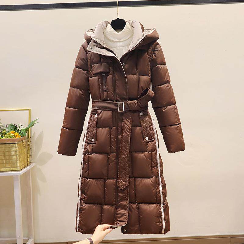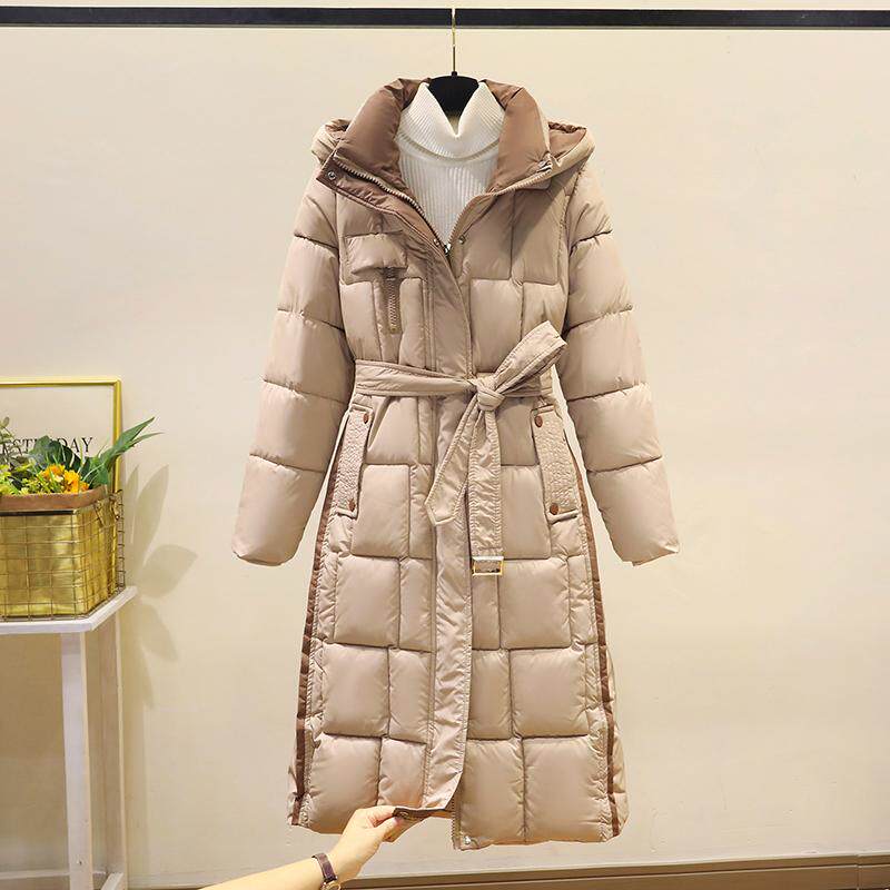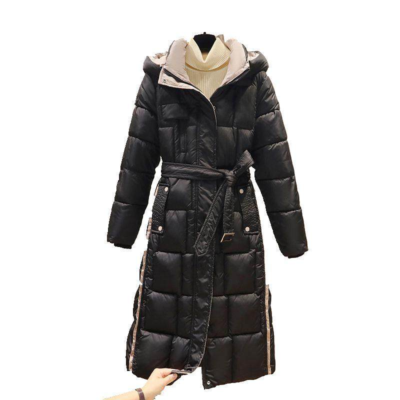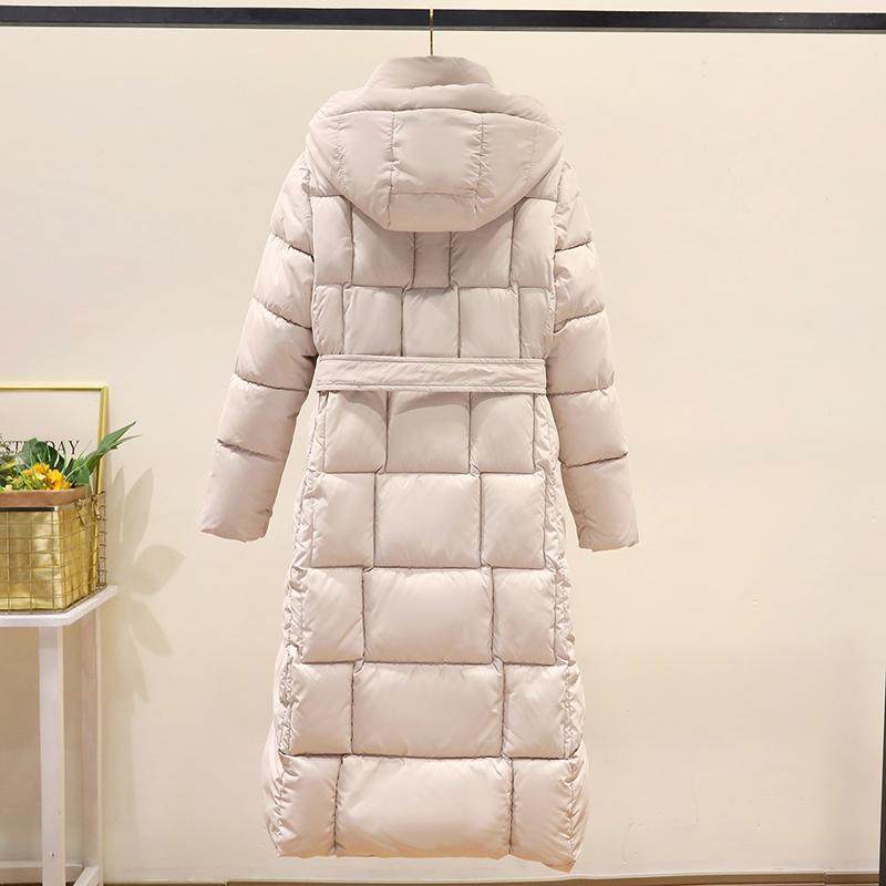 2024冬装修身收腰连帽棉袄大码系带宽松棉服中长款过膝羽绒棉衣女