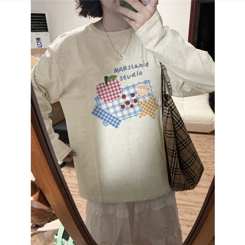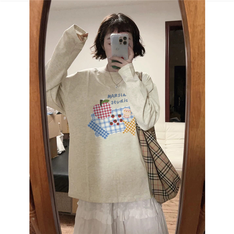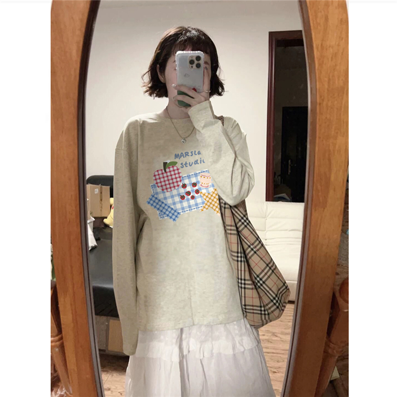 纯棉美式复古正肩长袖t恤女宽松