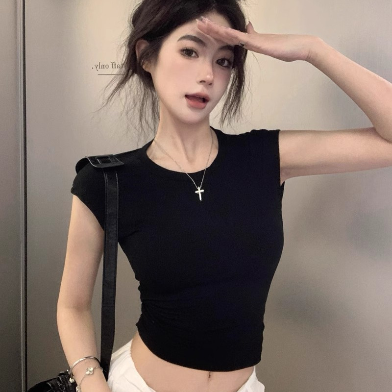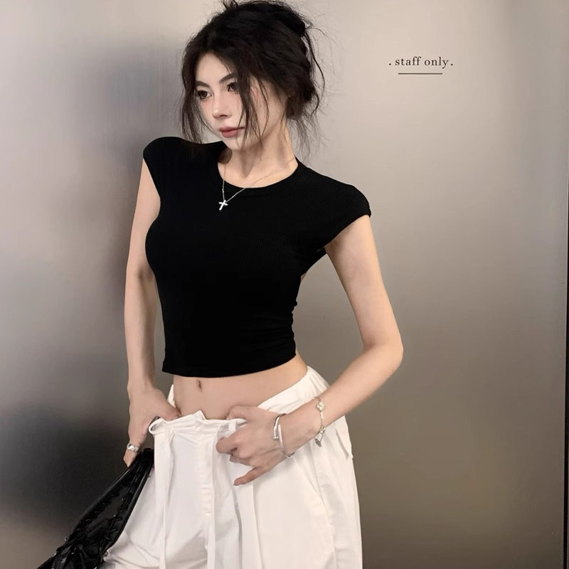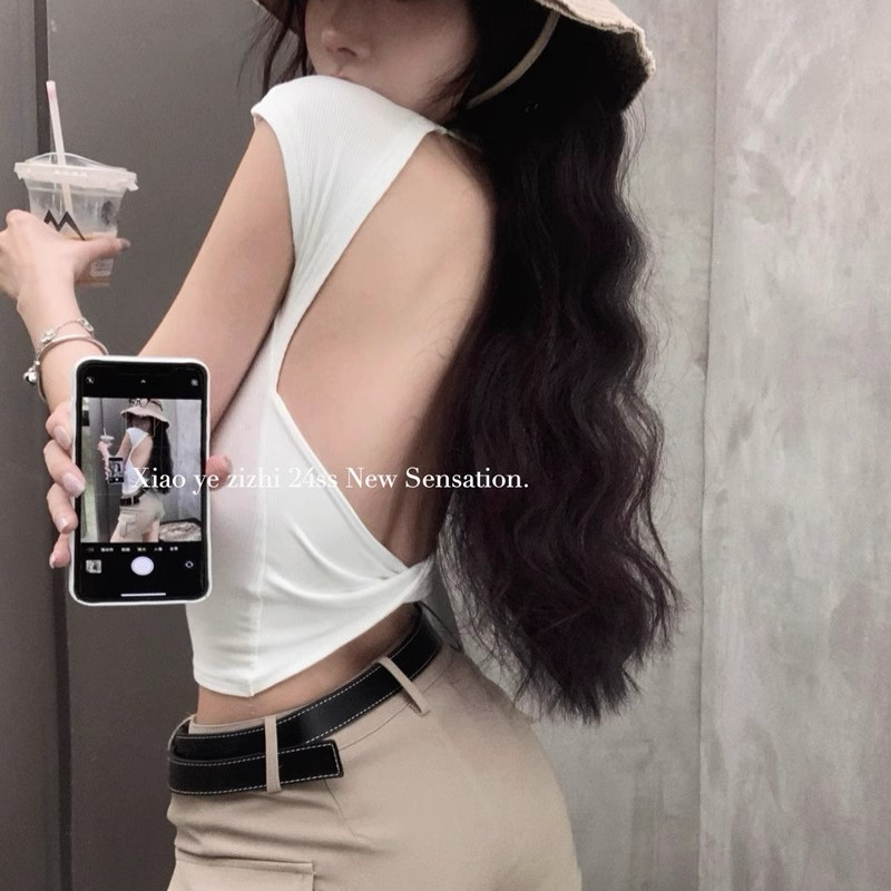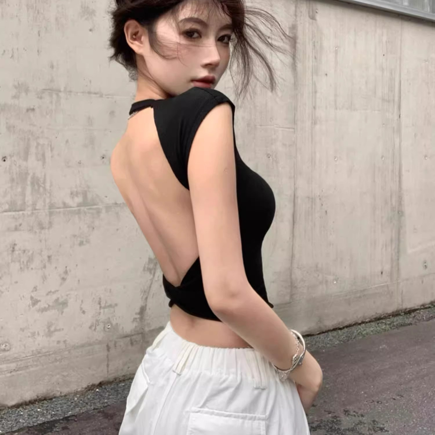 交叉镂空后背短袖t恤女夏季纯欲辣妹性感露背短款独特紧身小上衣