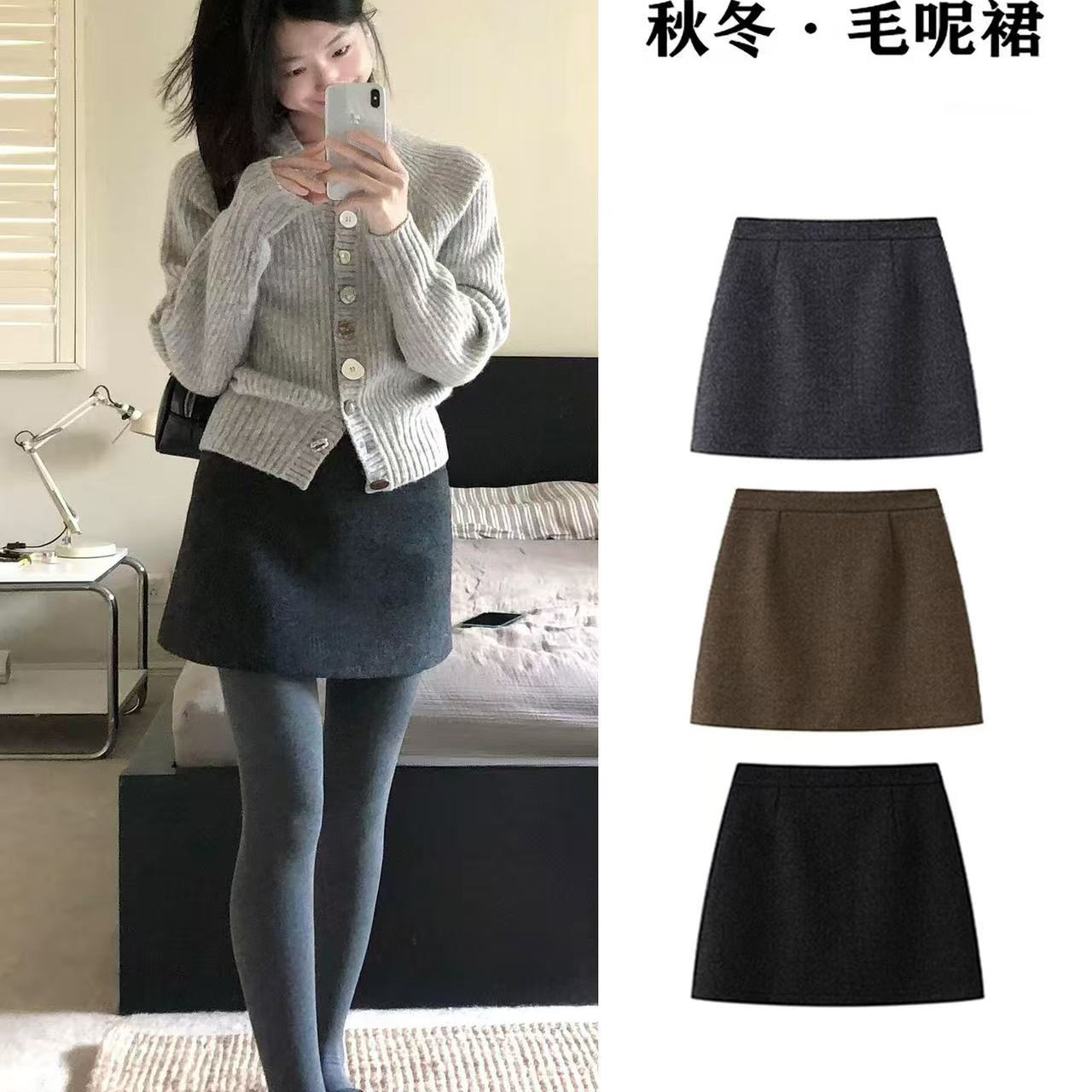 毛呢短裙秋冬灰色新款2025大码高腰显瘦a字裙胖m百搭黑色厚半身裙