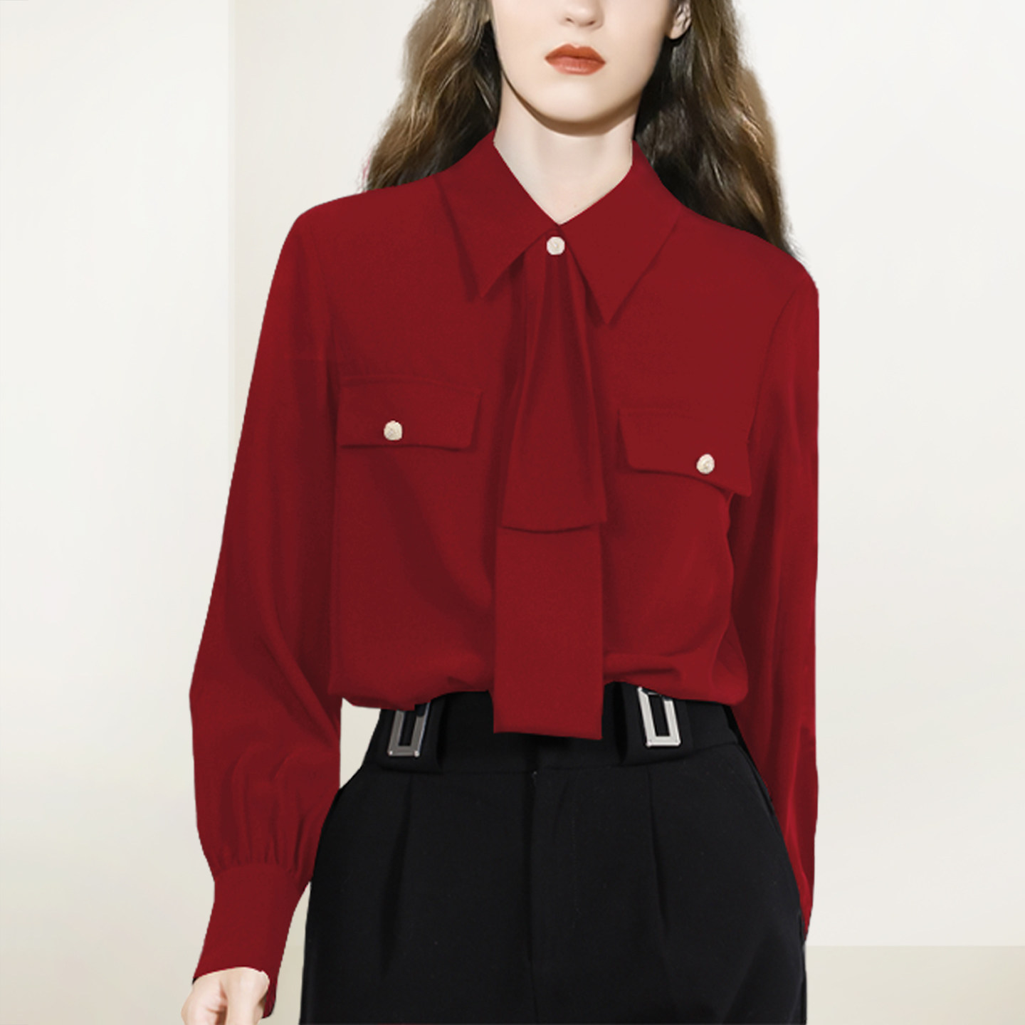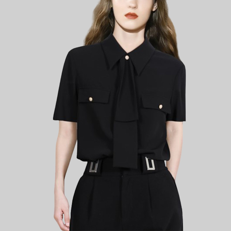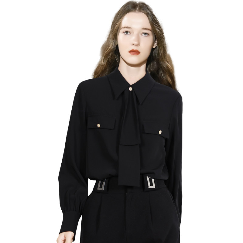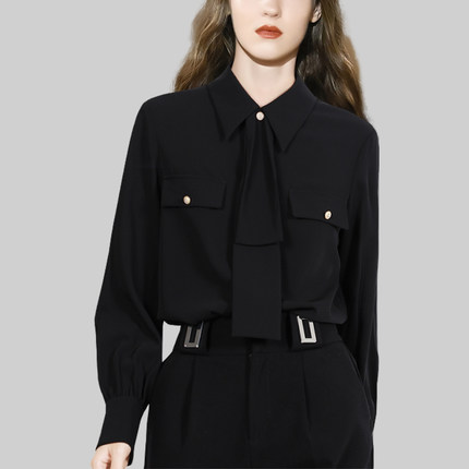 黑色系带长袖衬衫女2026年春季新款时尚复古通勤显瘦气质职业上衣