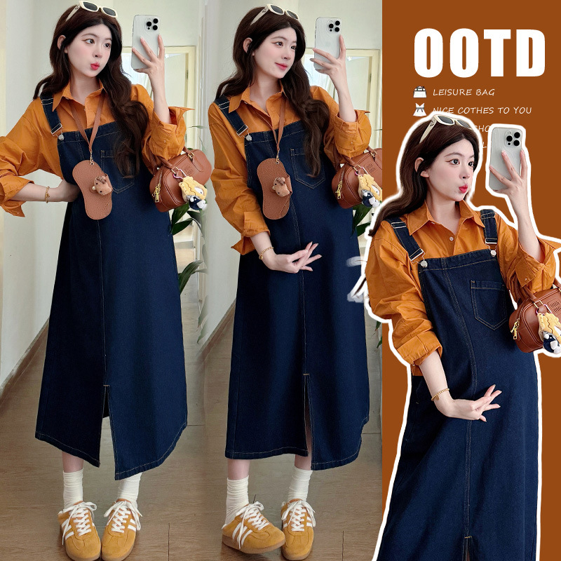 2025春季新款时尚深色牛仔背带裙+衬衣两件套显瘦外穿孕妇套装潮
