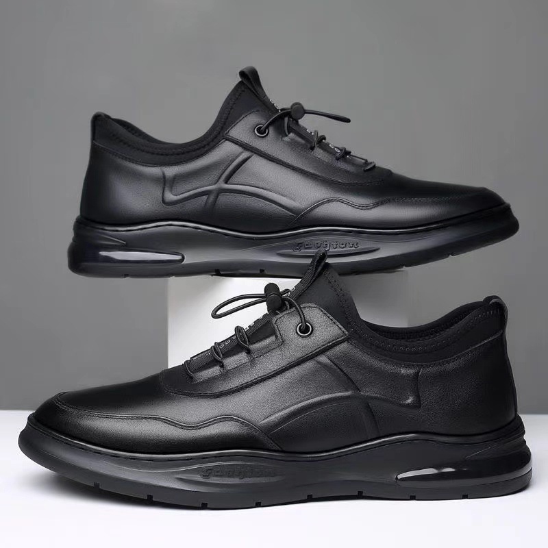 男鞋秋季新款休闲商务皮鞋百搭时尚潮流气垫松紧带黑色运动皮面