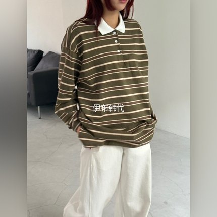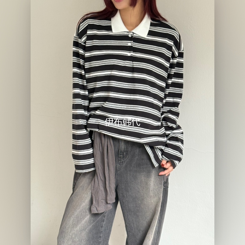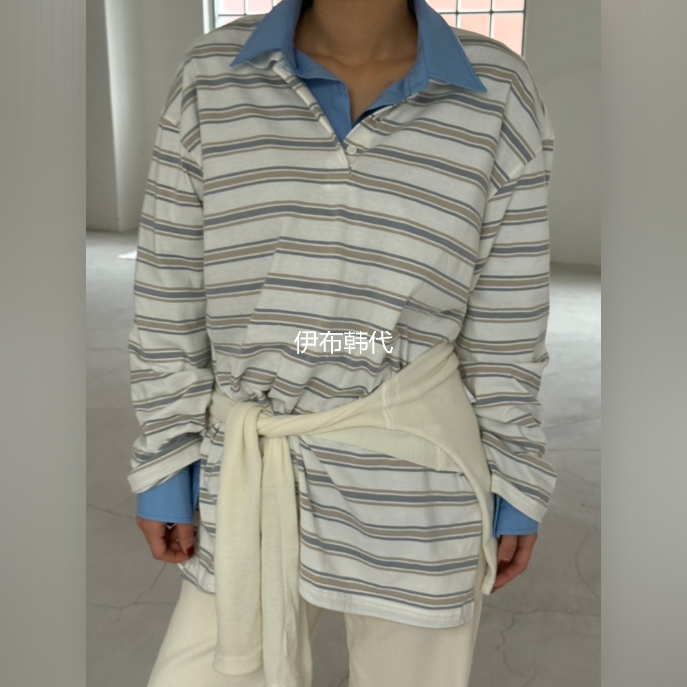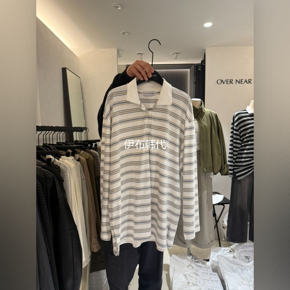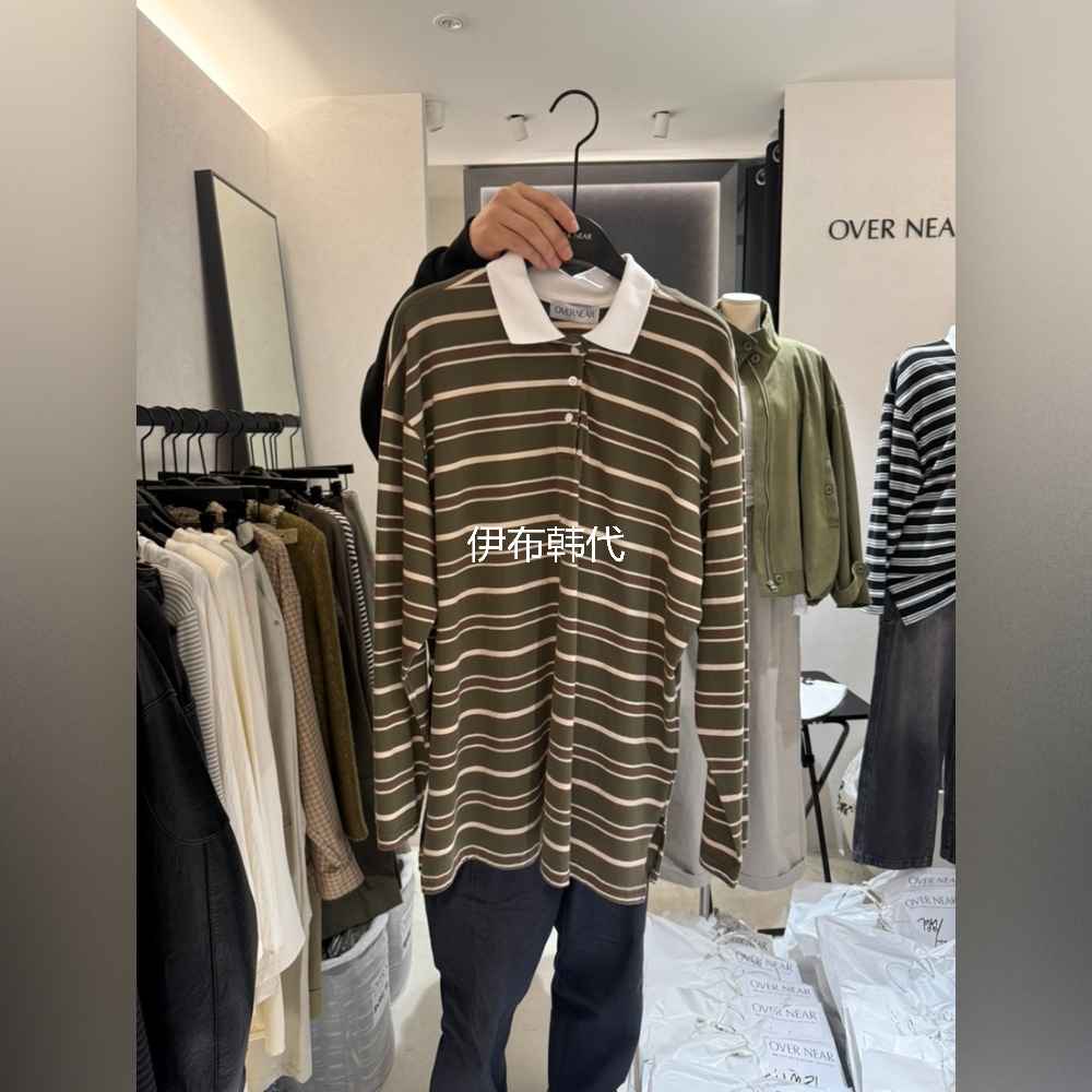 OVER NEAR韩国东大门正品代购25冬款 翻领休闲纽扣条纹宽松T恤