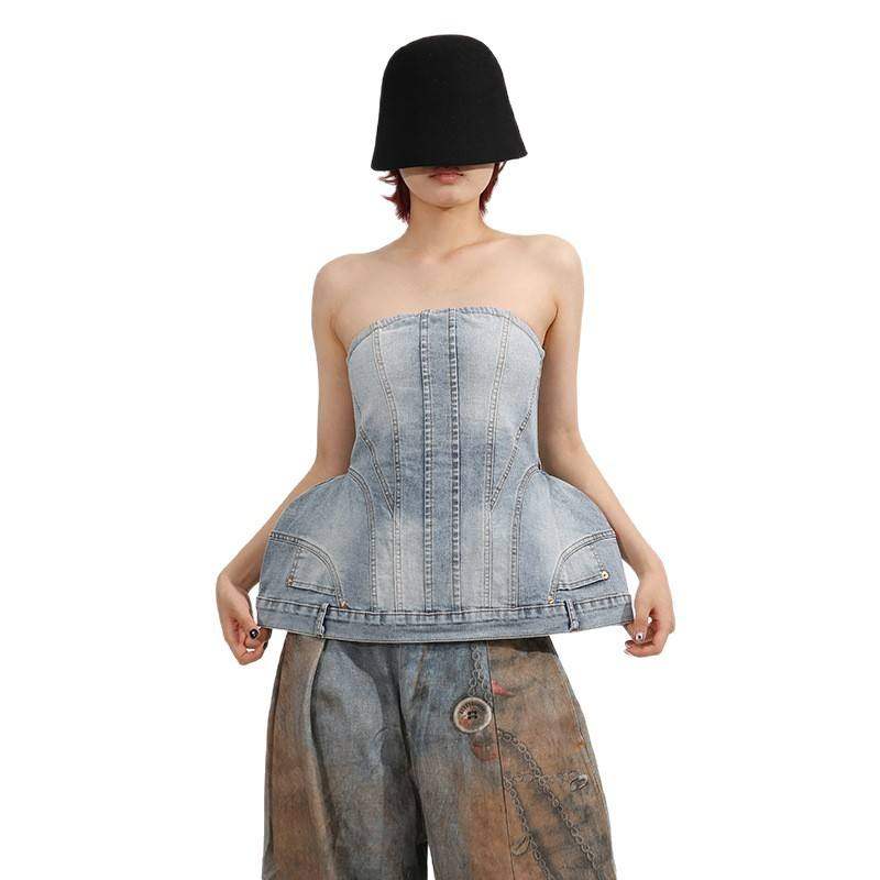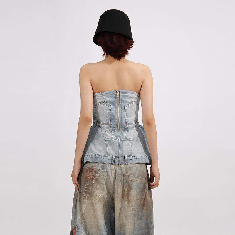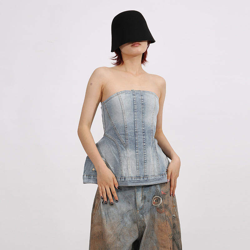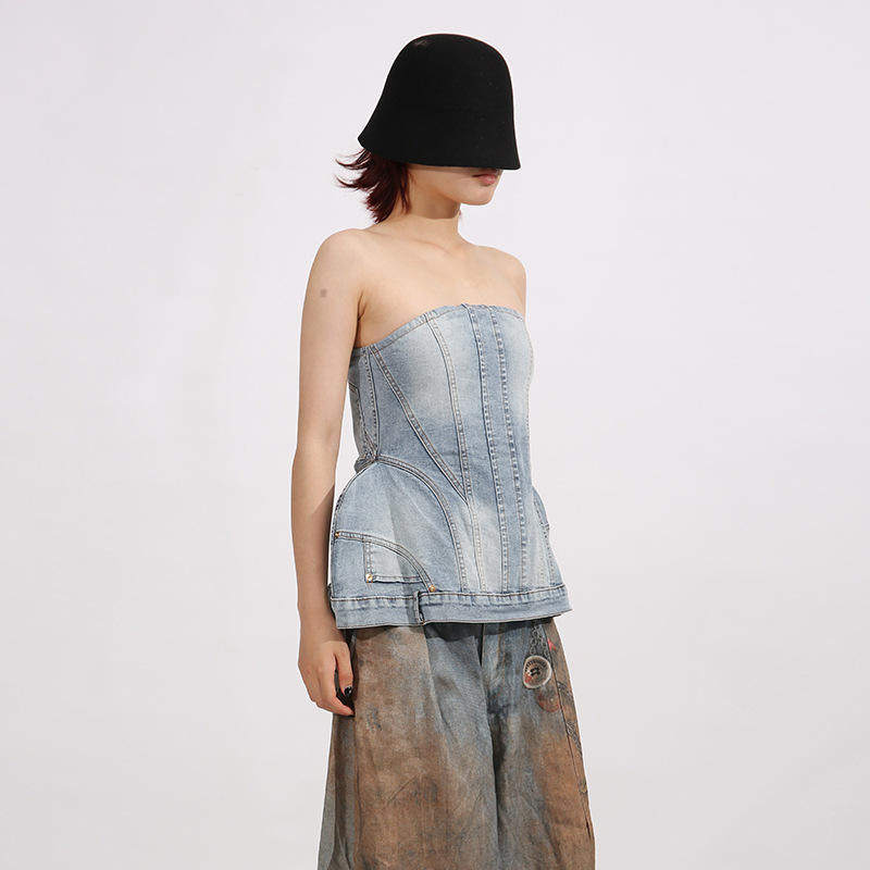 个性街头别致2025秋冬立体造型收腰紧身牛仔抹胸上衣女式背心吊带