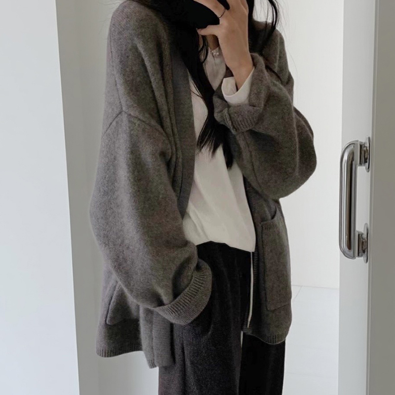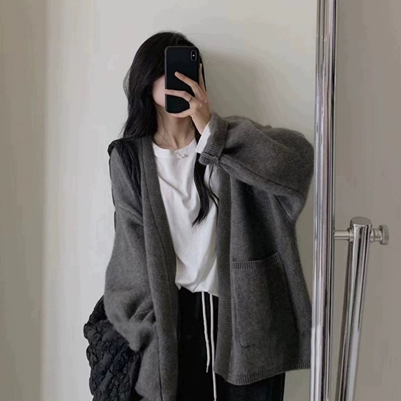 慵懒风灰色中长款毛衣外套女秋冬老钱风宽松加厚针织开衫外搭上衣