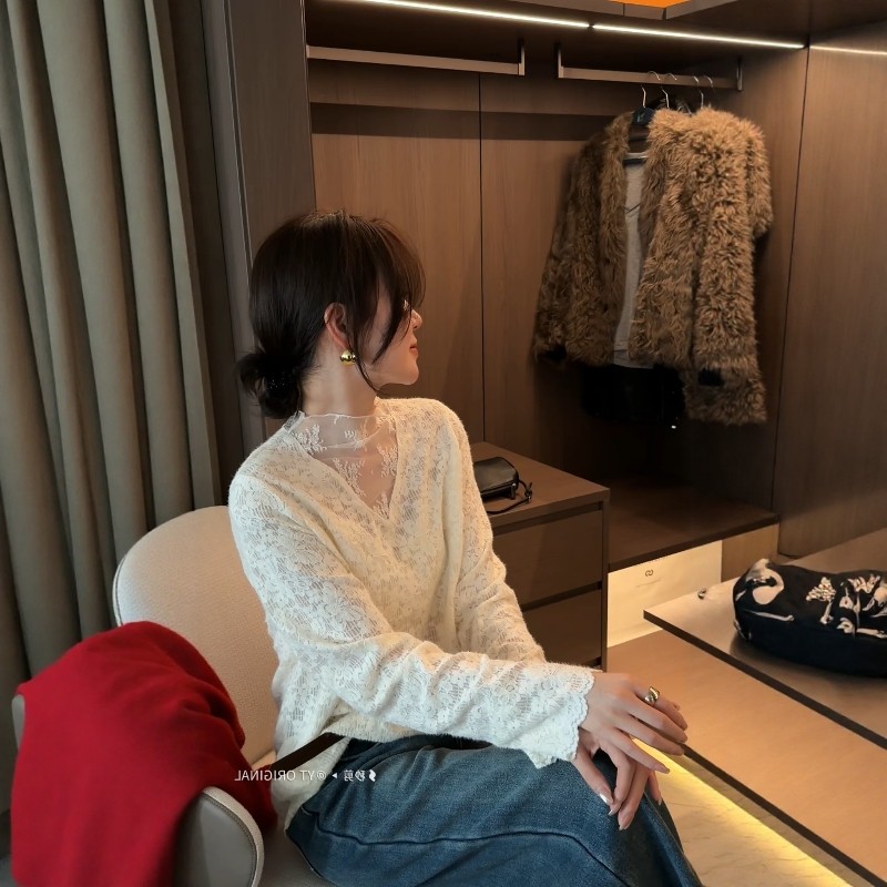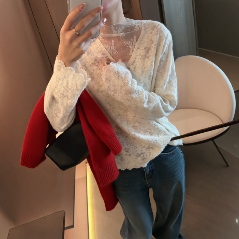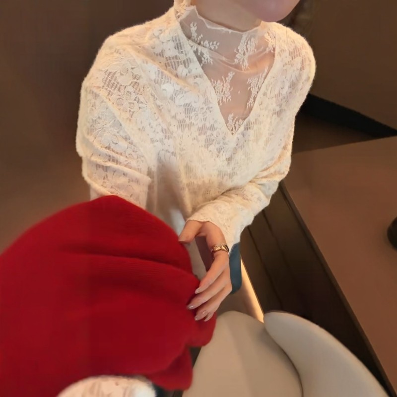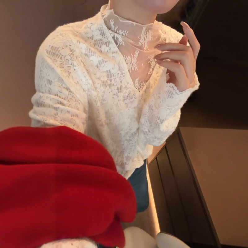 韩版时尚百搭V领蕾丝衫女长袖打底衫休闲风上衣2025冬季新品加厚