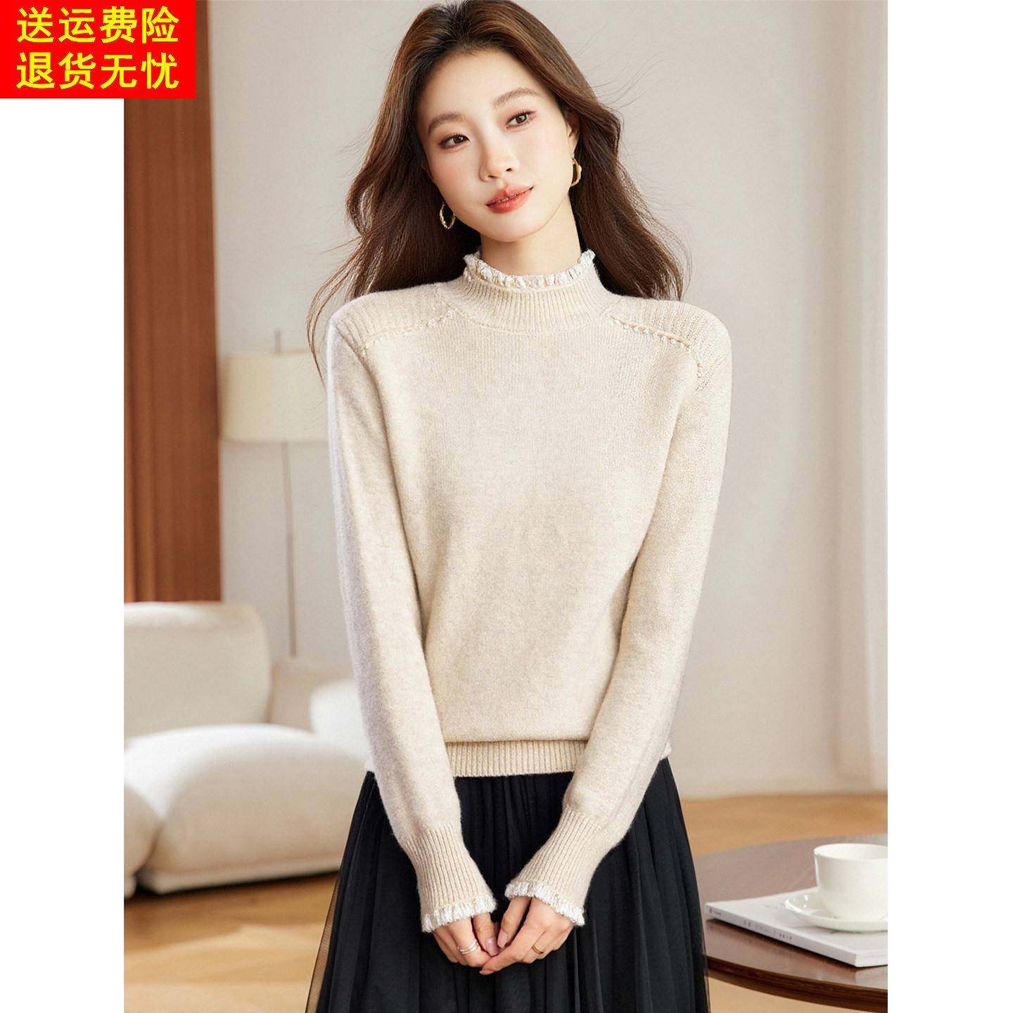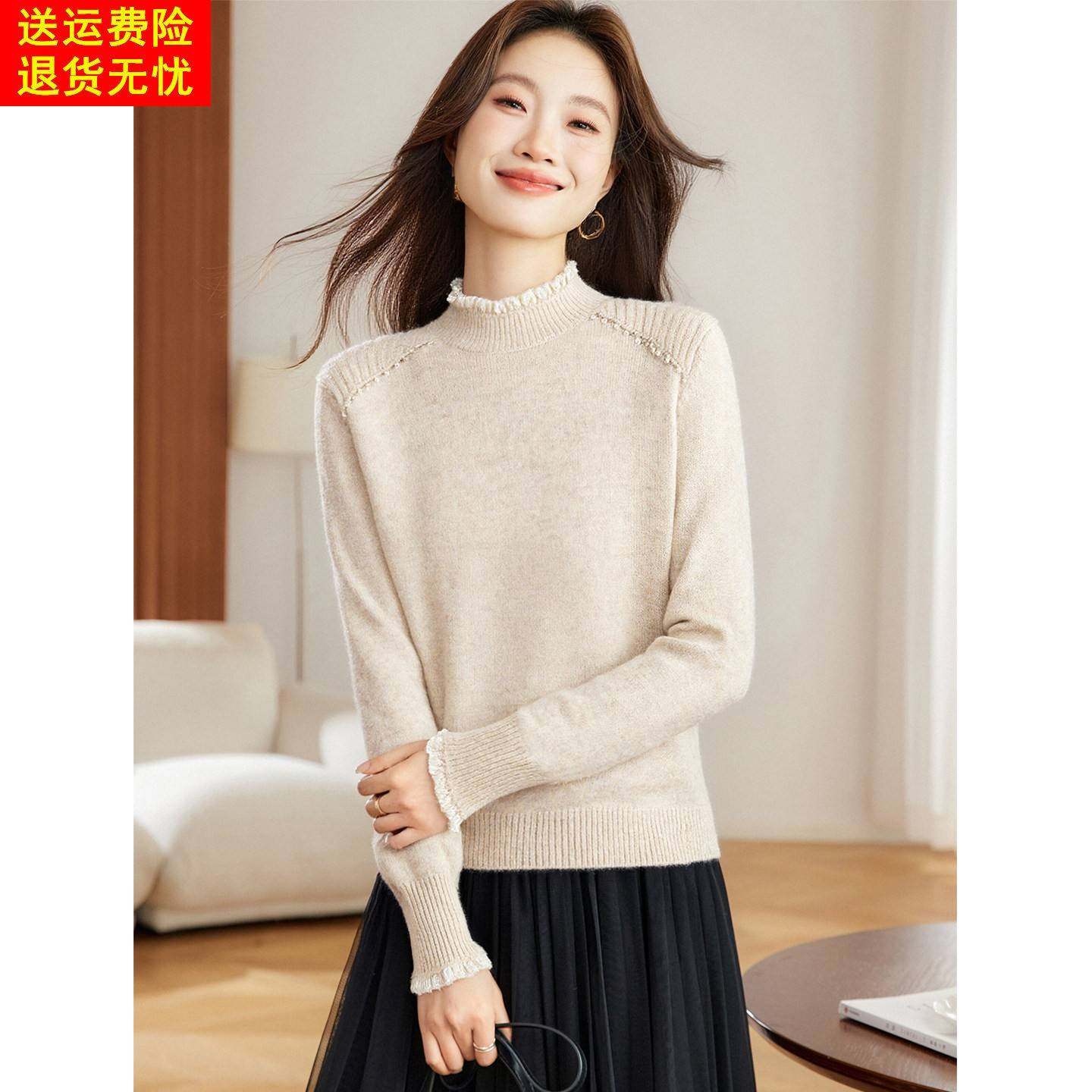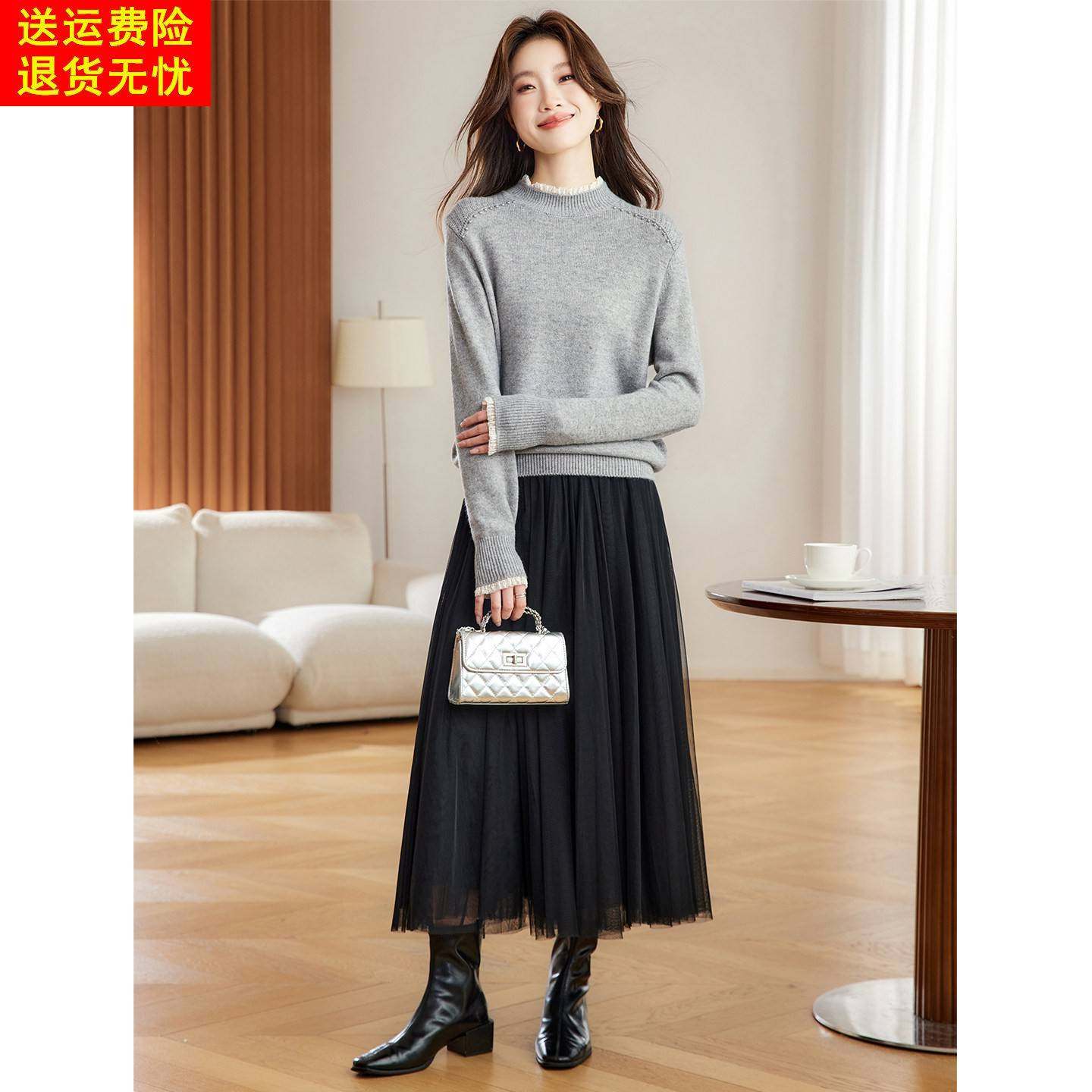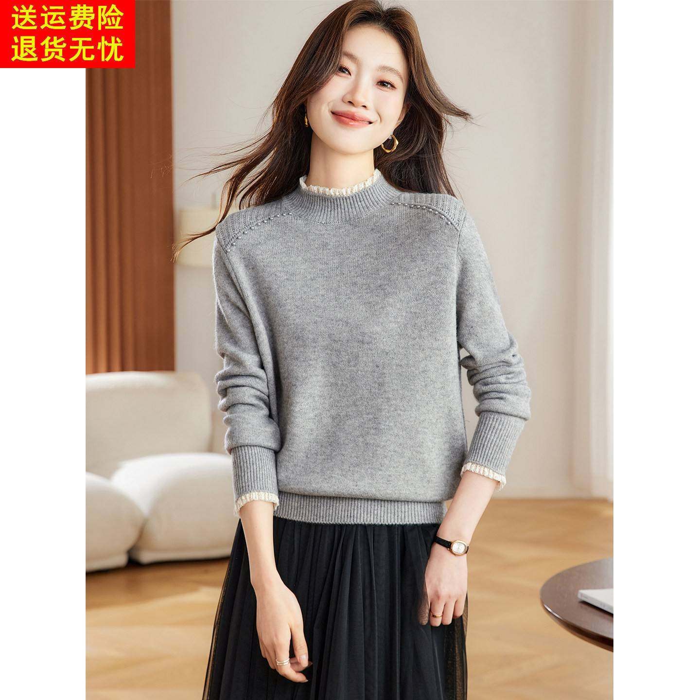 蕾丝边钉珠半高领灰色毛衣女秋冬2025新款洋气减龄短款内搭打底衫