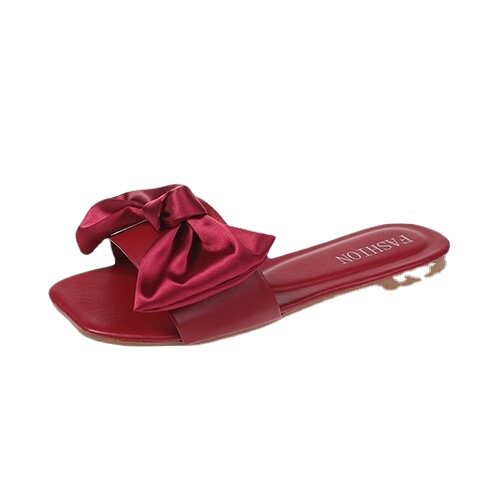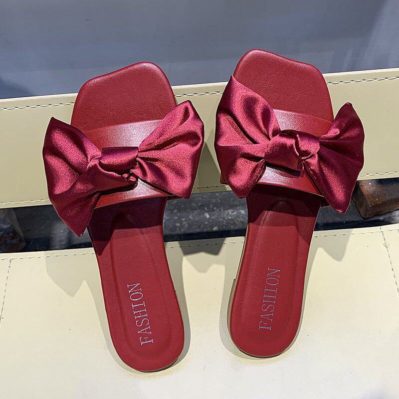 2023春夏新款结婚伴娘拖鞋女新婚绸缎红拖鞋婚礼新娘晨袍搭配鞋女