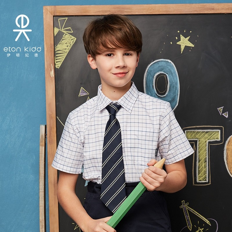 伊顿纪德夏季男童校服套装格子衬衫中小学生班服团购儿童短袖衬衫