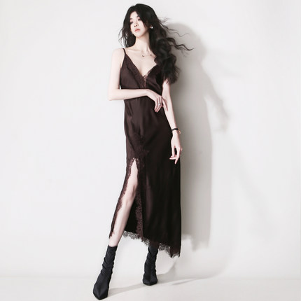 F2蕾丝拼接镂空V领不对称开叉斜下摆欧美风显瘦缎面吊带连衣长裙