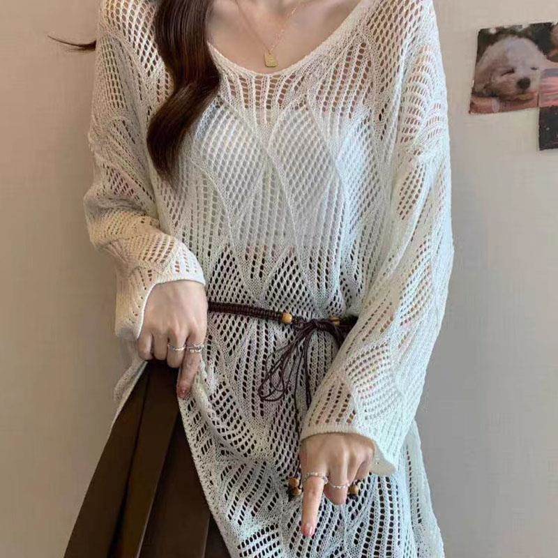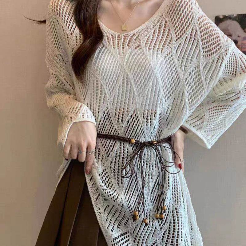 法式慵懒风领镂空针织衫女夏季新款胖时尚显瘦防晒中长款上衣