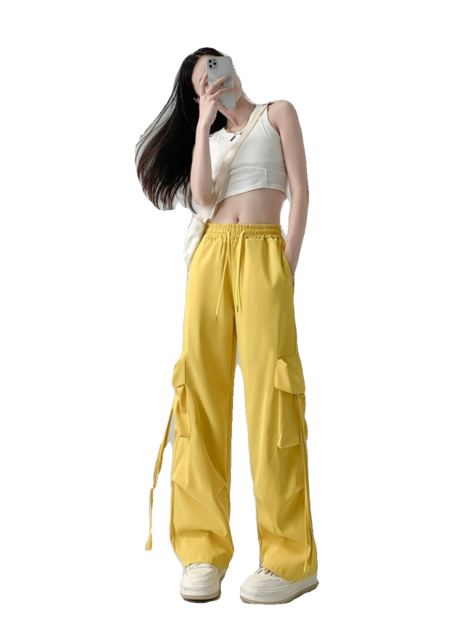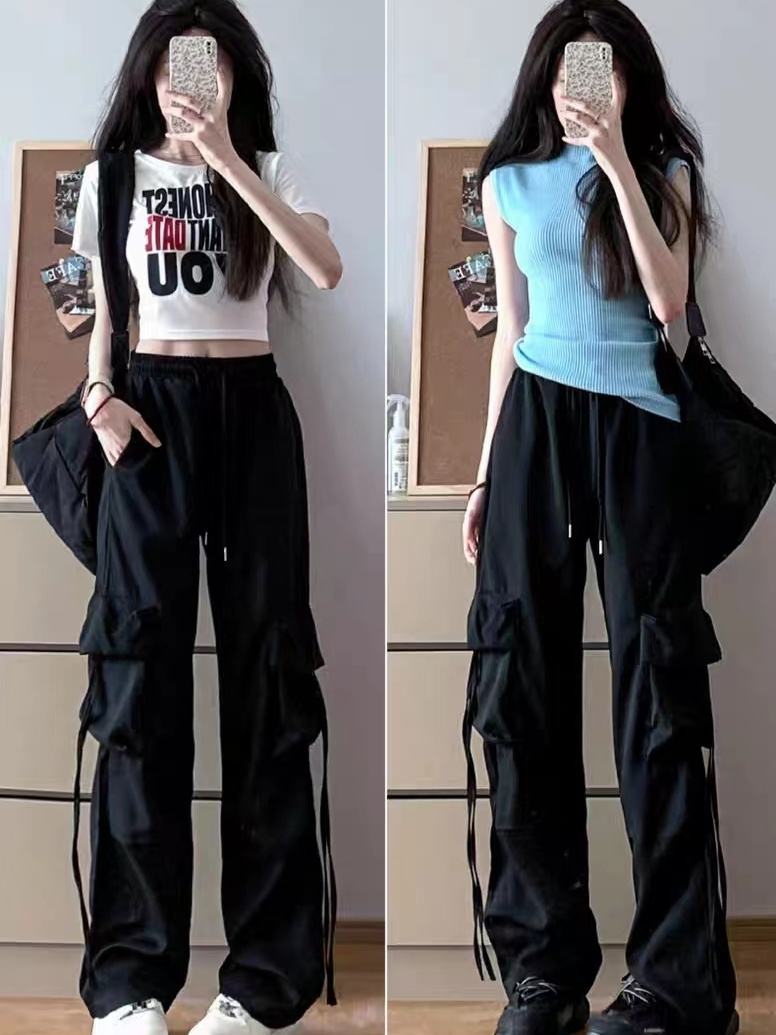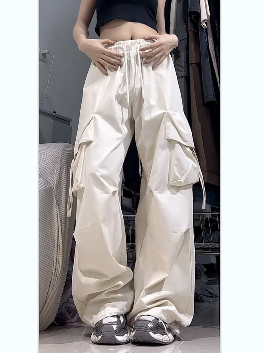 薄款/加绒粉色工装裤子女学生高腰降落伞休闲百搭阔腿美式运动裤