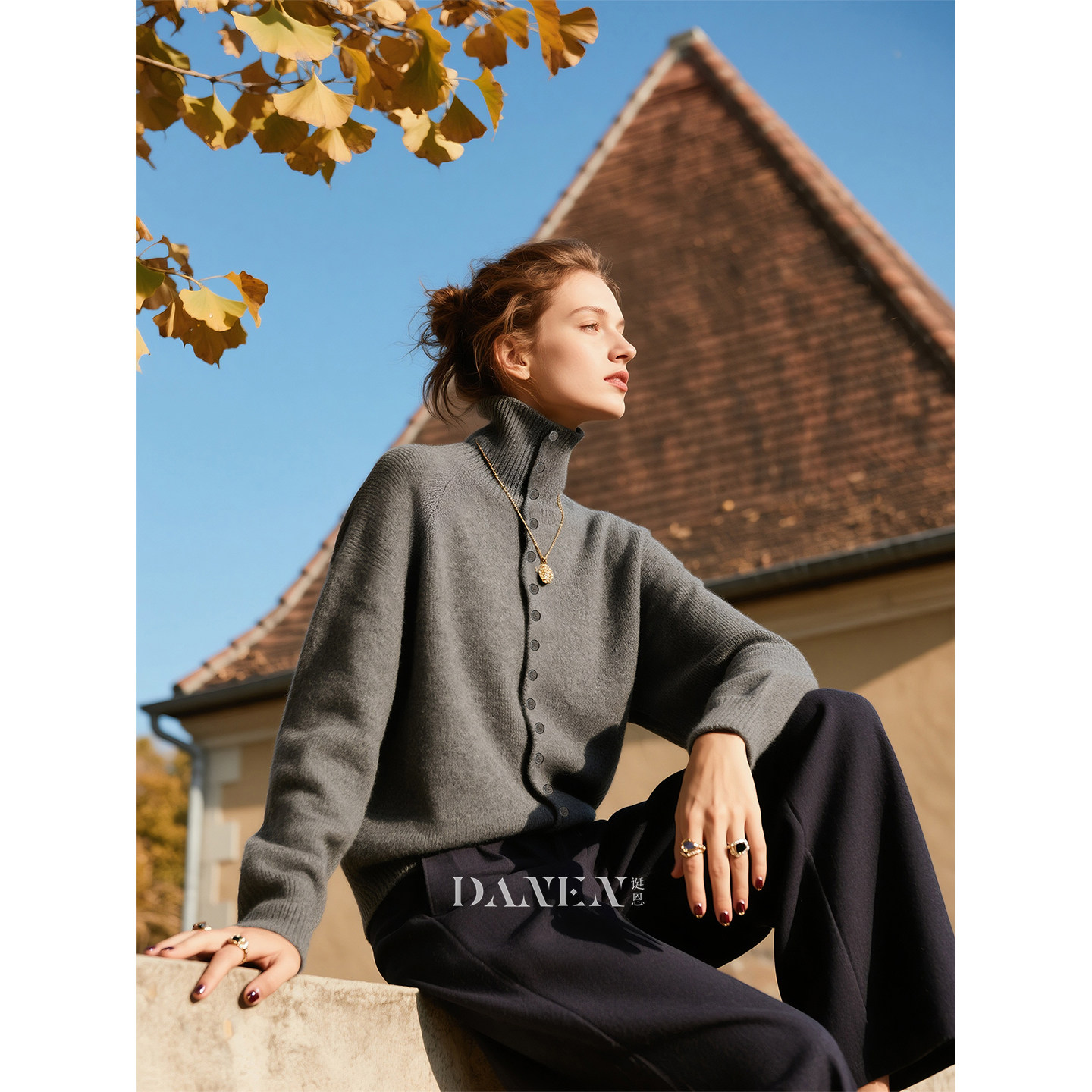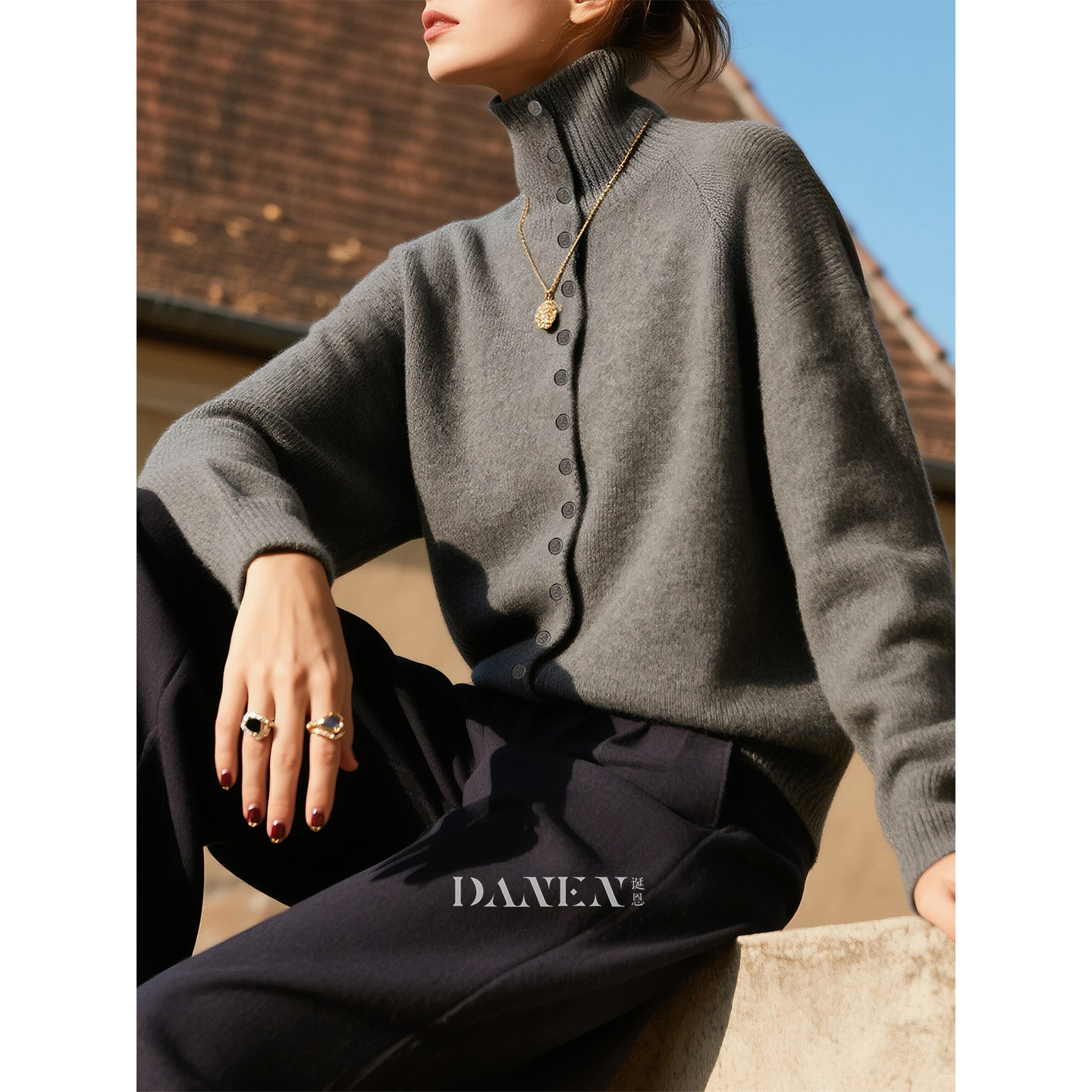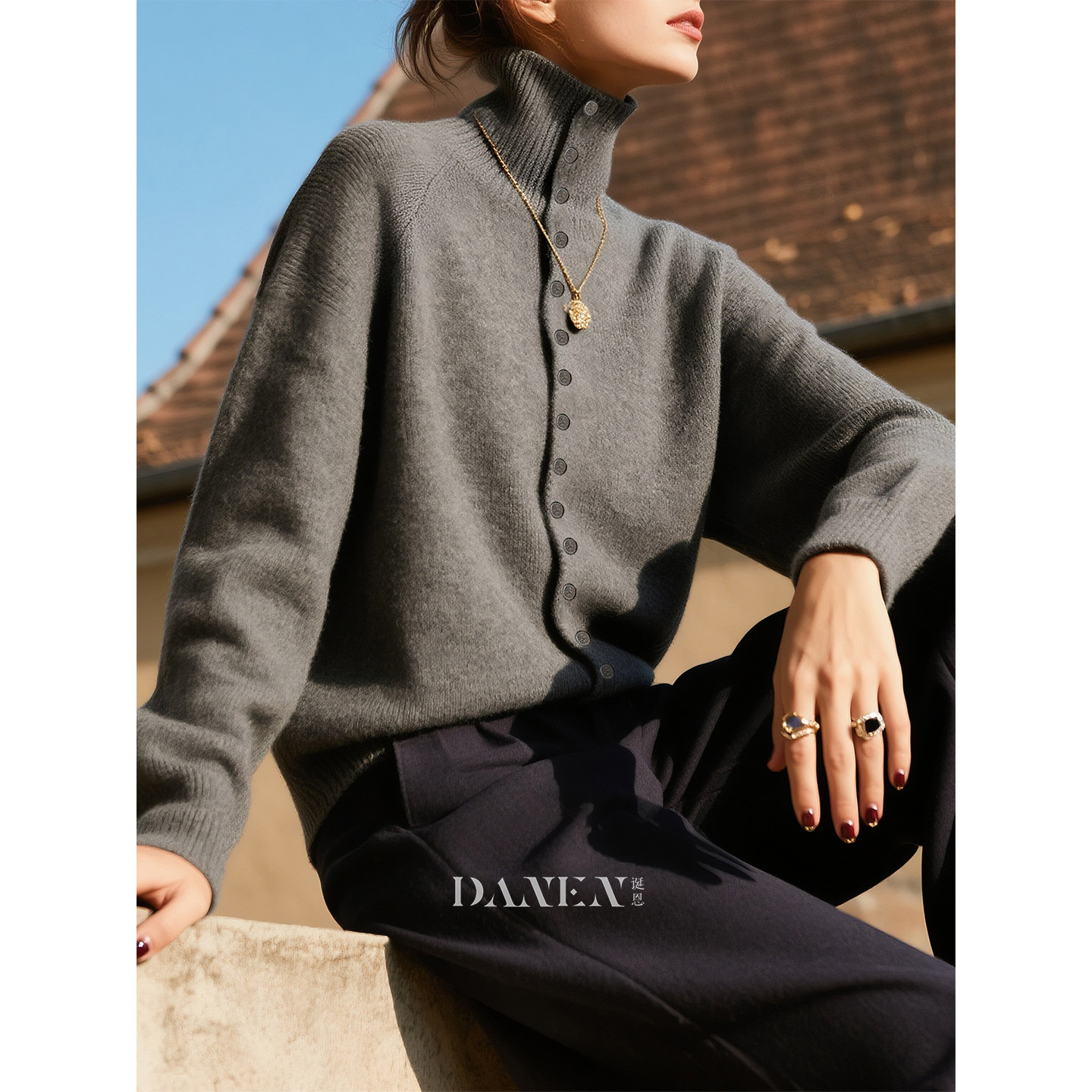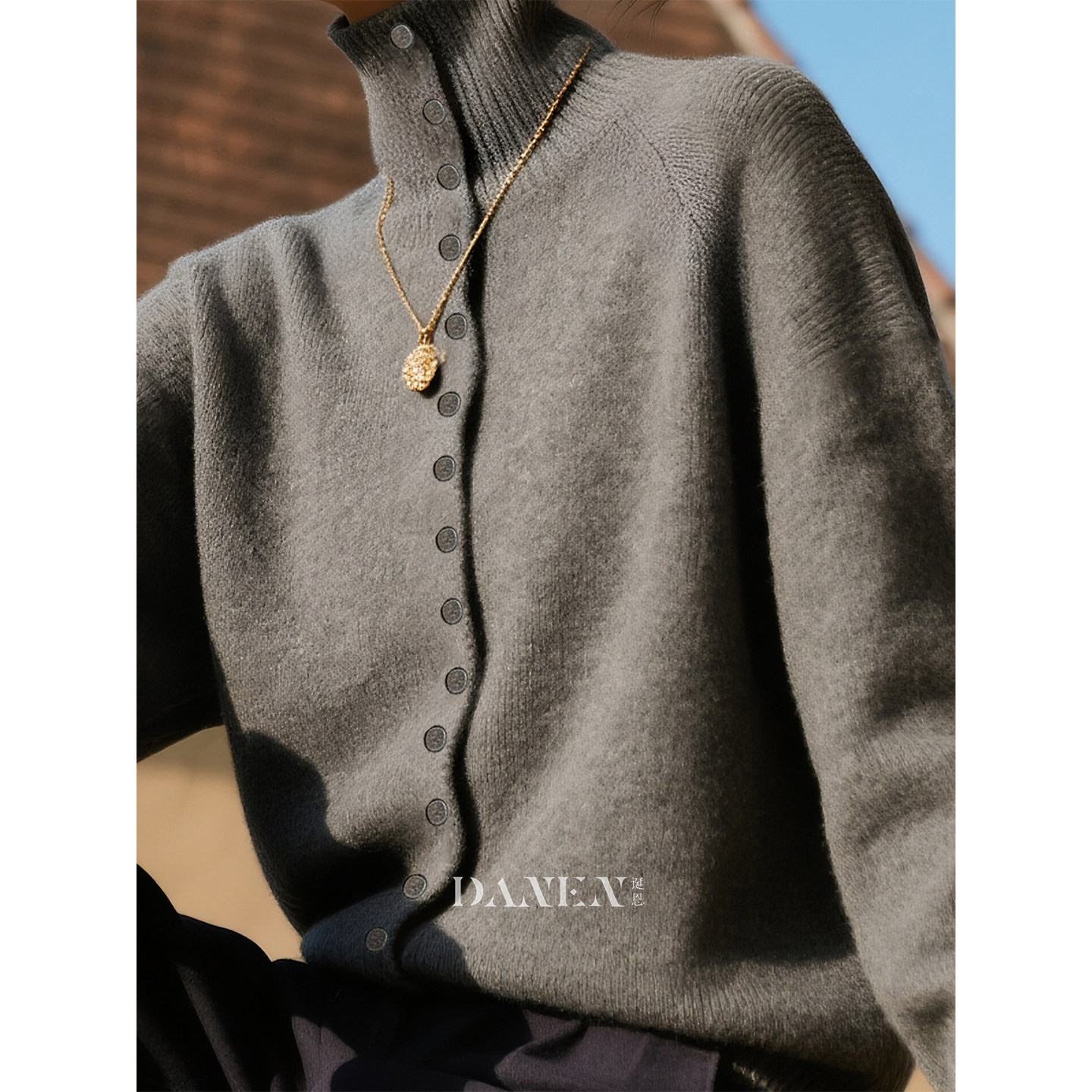 灰色高领排扣针织衫女2025年秋冬新款宽松高级感气质简约毛衣外套
