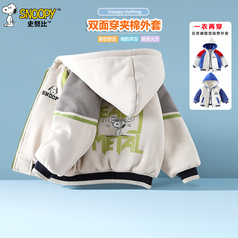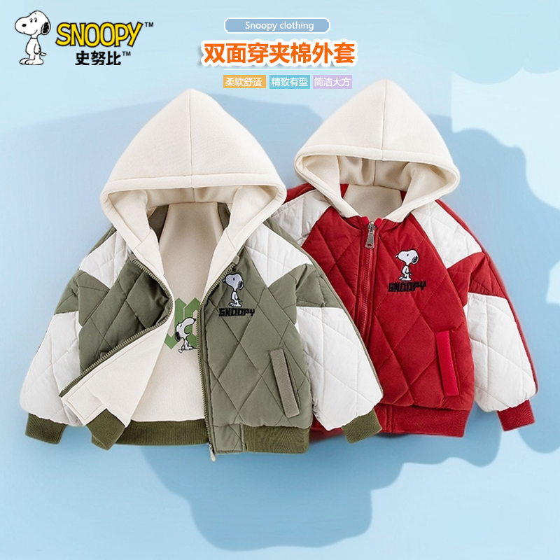 正品史努比童装男童短款厚外套2025秋冬装儿童双面穿棉衣连帽卫衣