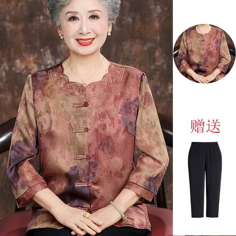 妈妈桑蚕丝新款唐装上衣中老年人宽松春秋衬衫奶奶真丝夏季衬衫女