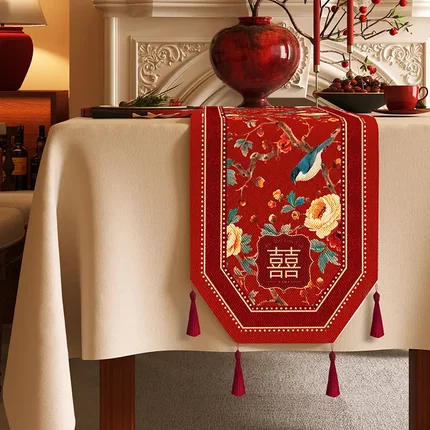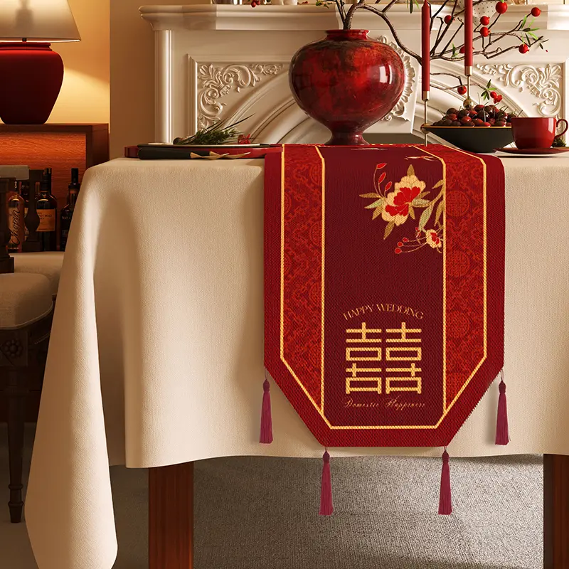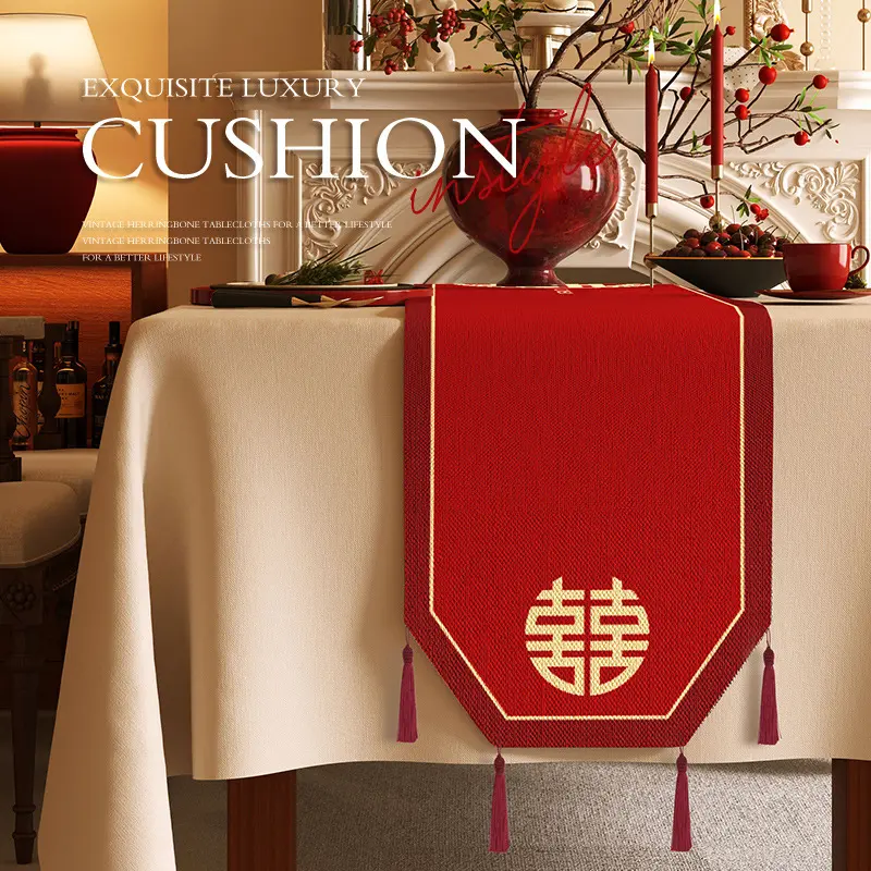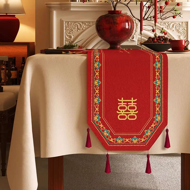 顺便买卖结婚桌旗红色喜字防水餐桌布棉麻布艺电视机柜盖布茶几布