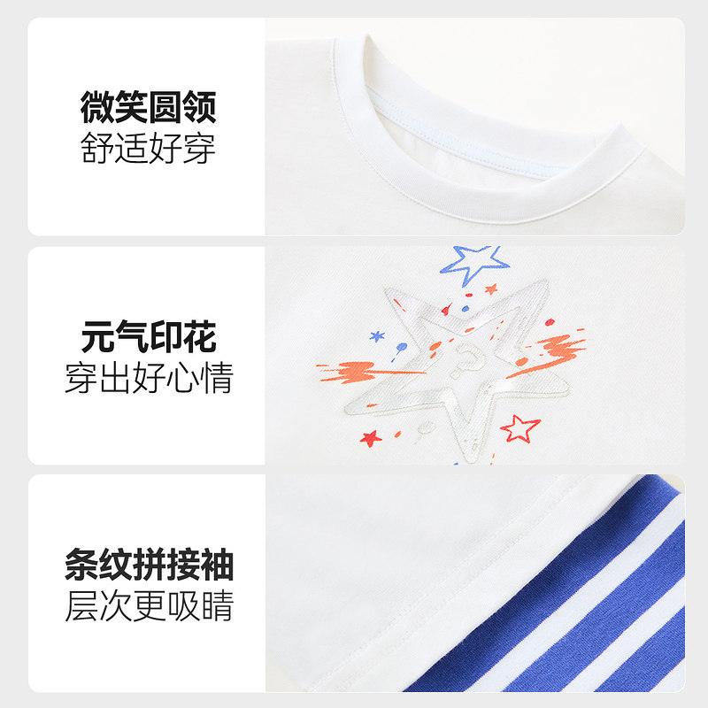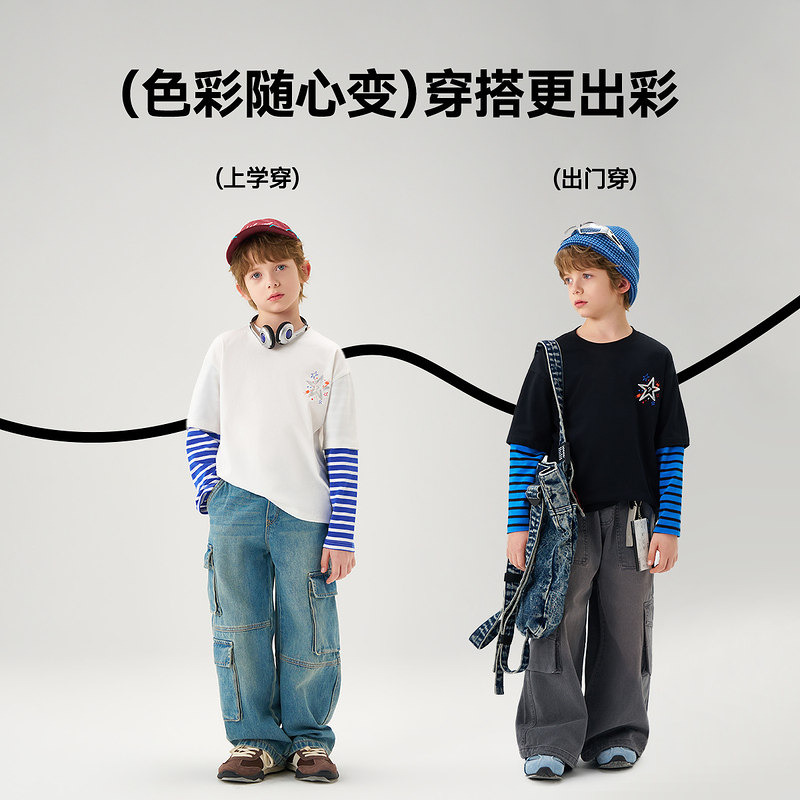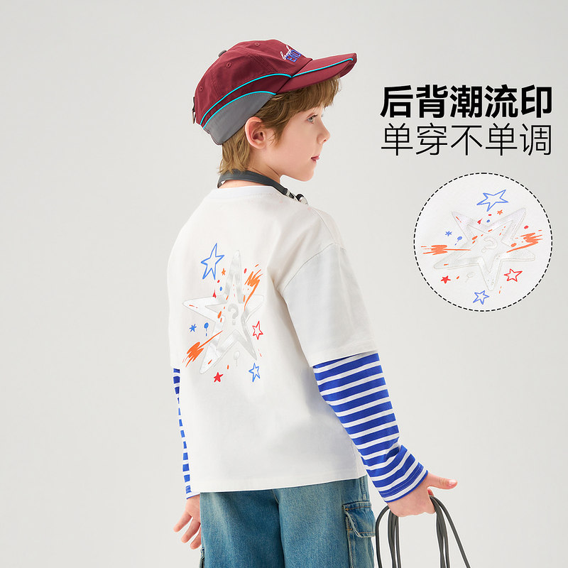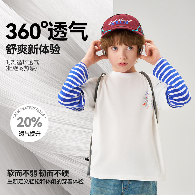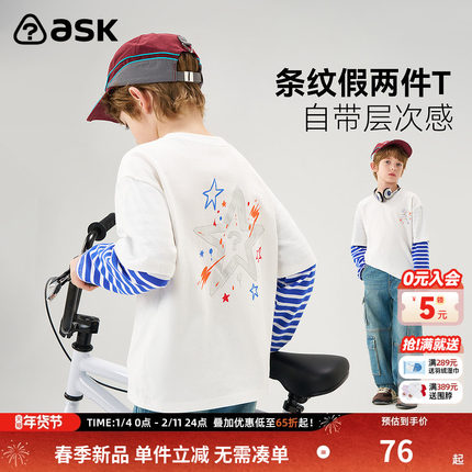【2026春季新款】ask儿童T恤男童假两件上衣中大童蓝色条纹长袖