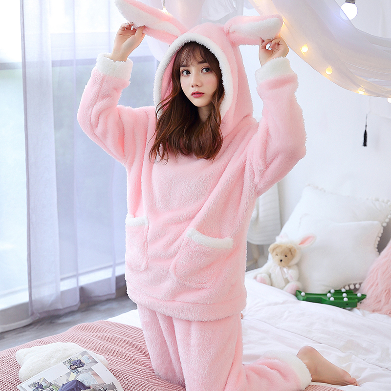 珊瑚绒睡衣女秋冬季学生连帽加厚毛茸茸可爱兔子保暖家居服可外穿
