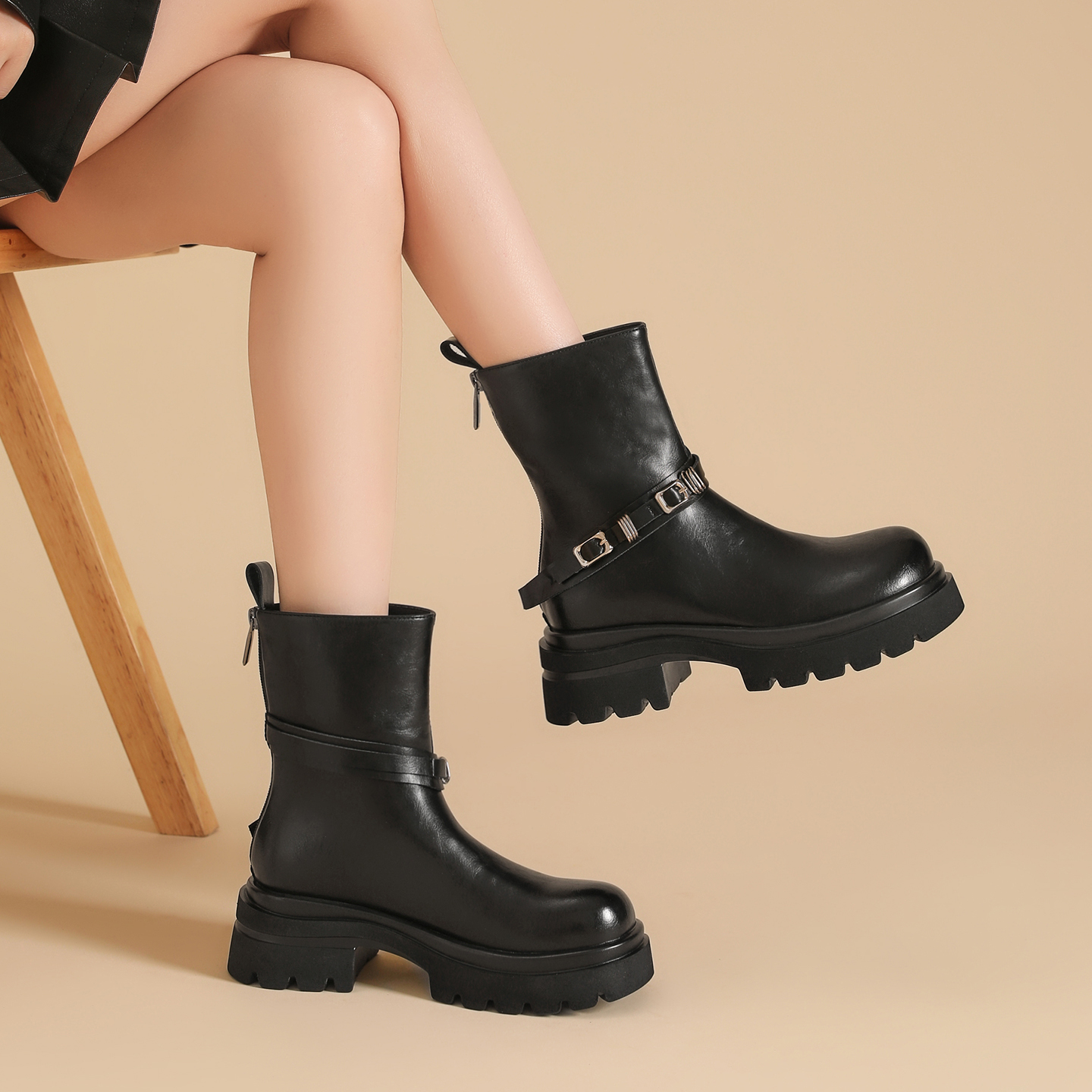 女鞋爆款皮面骑士靴秋冬新款马丁靴百搭时尚切尔西靴厚底时尚女靴