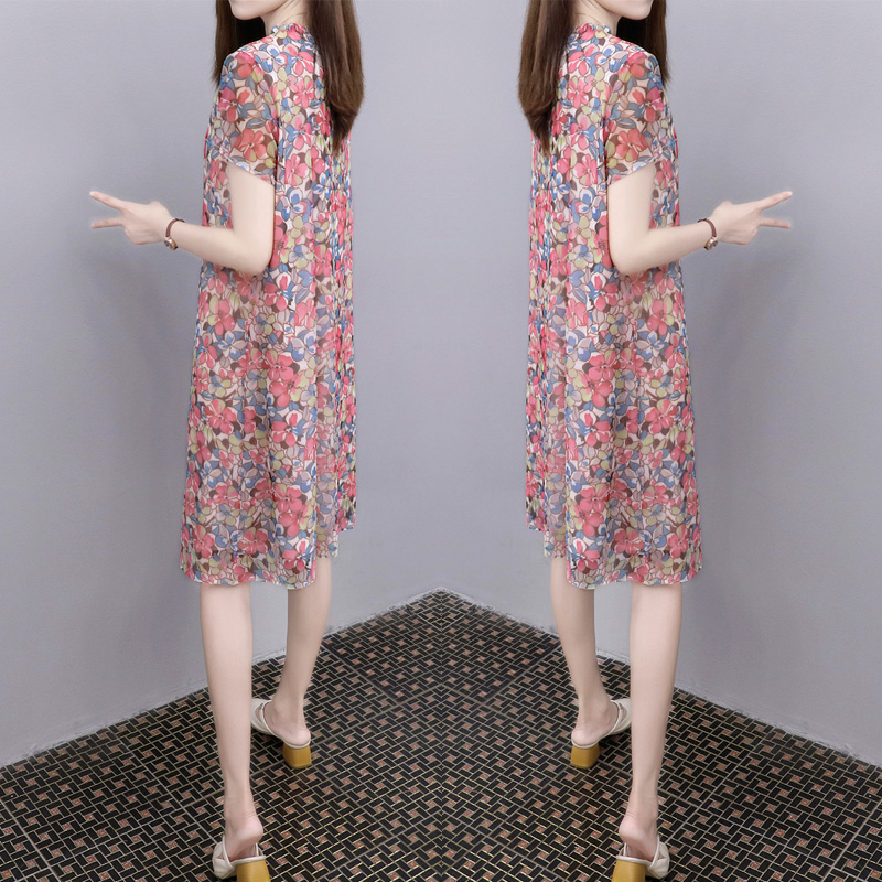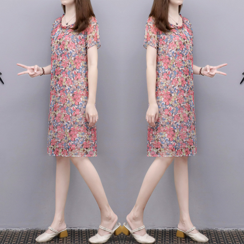 2025夏季时尚红花朵裙中长款宽松遮肉大码减龄雪纺网纱连衣裙女装