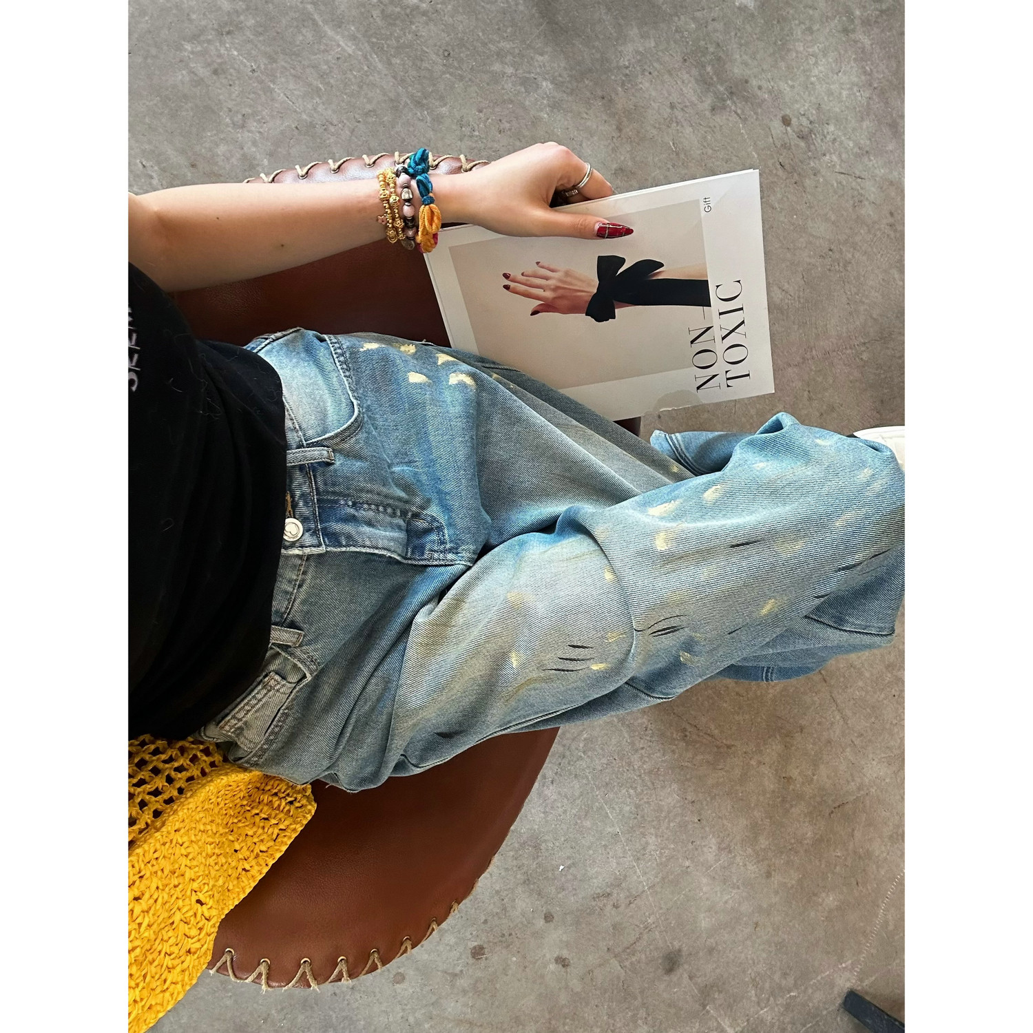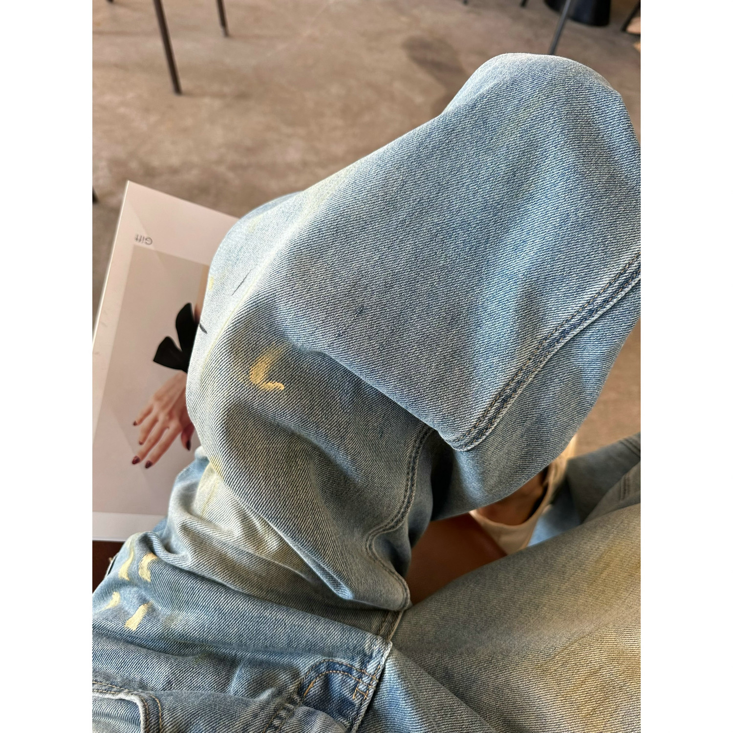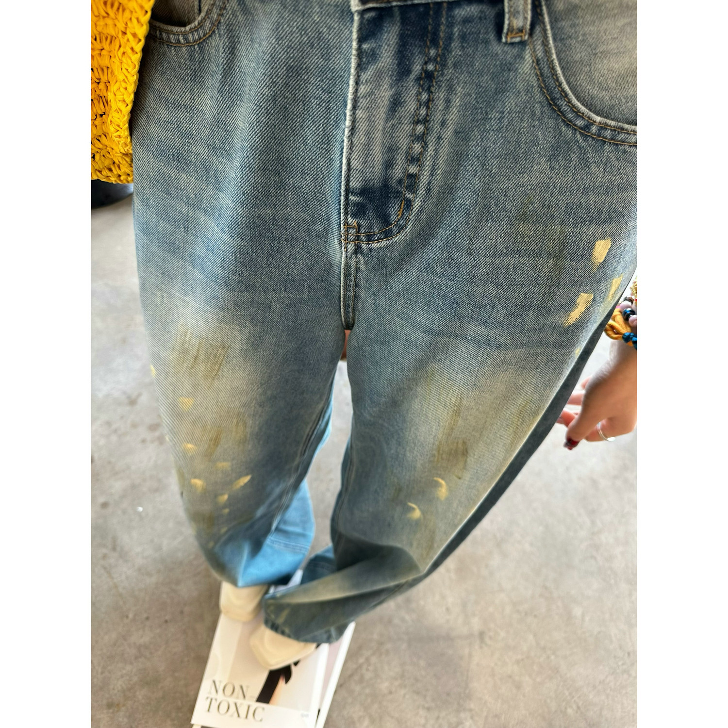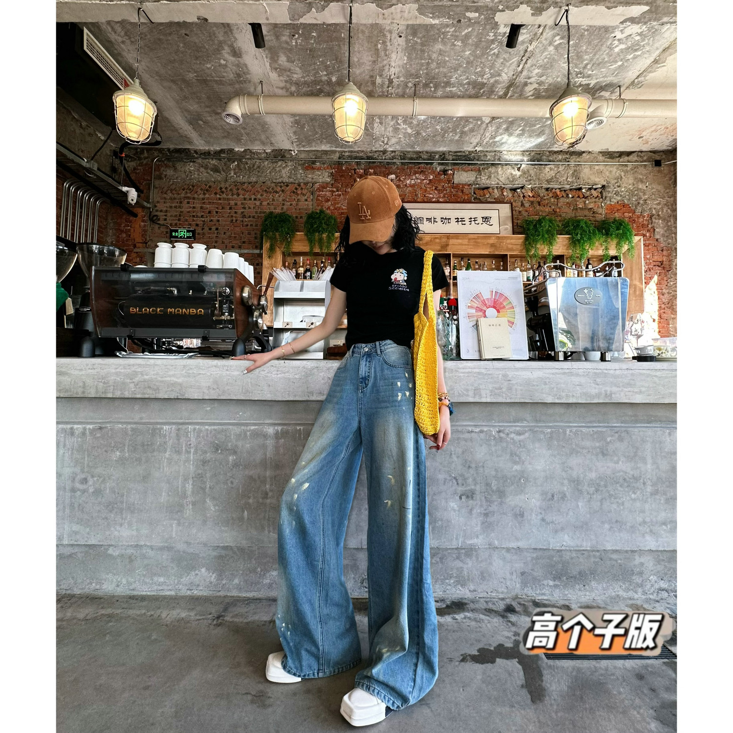 猫猫家加长女裤春夏薄款泼墨水洗小众复古休闲直筒宽松阔腿牛仔裤