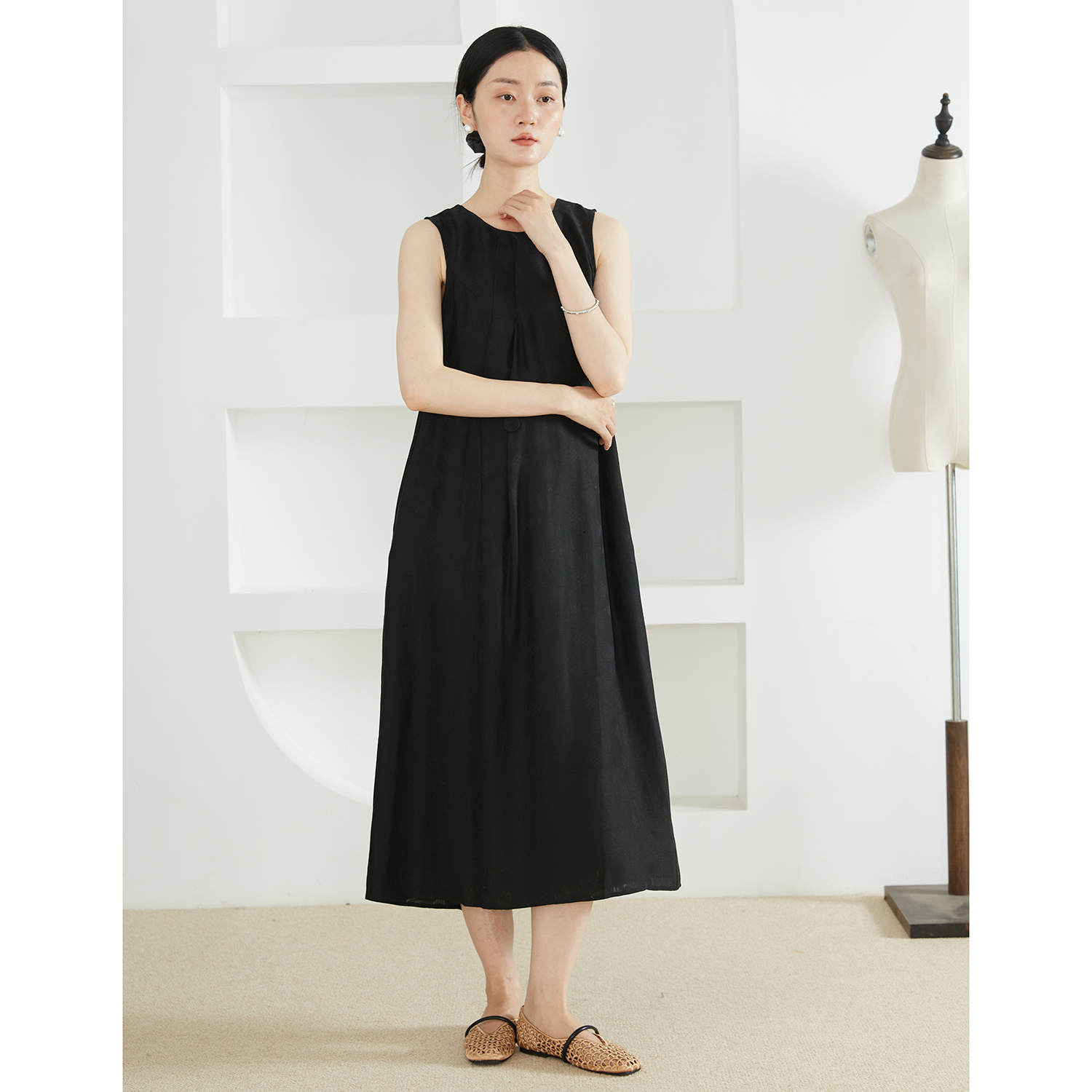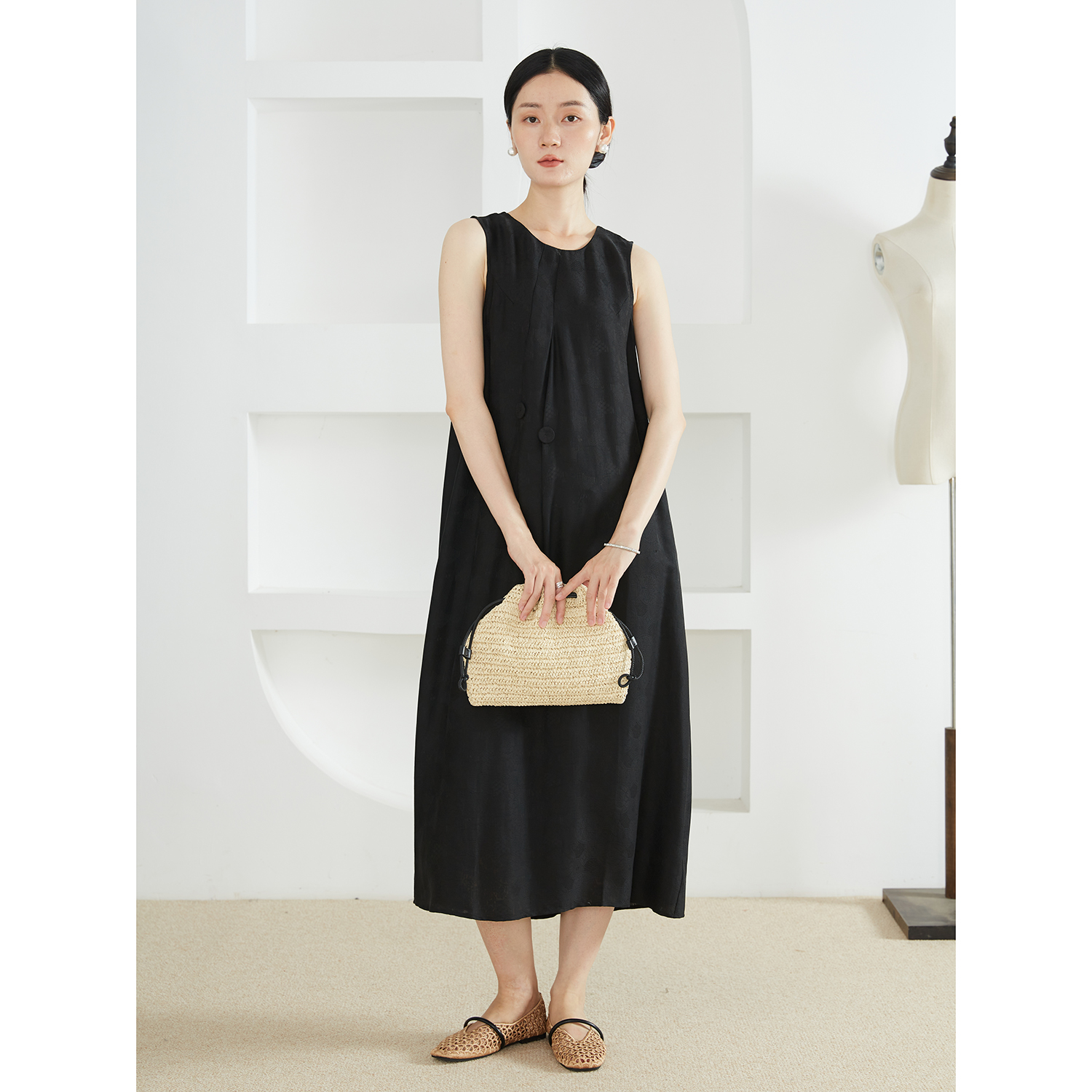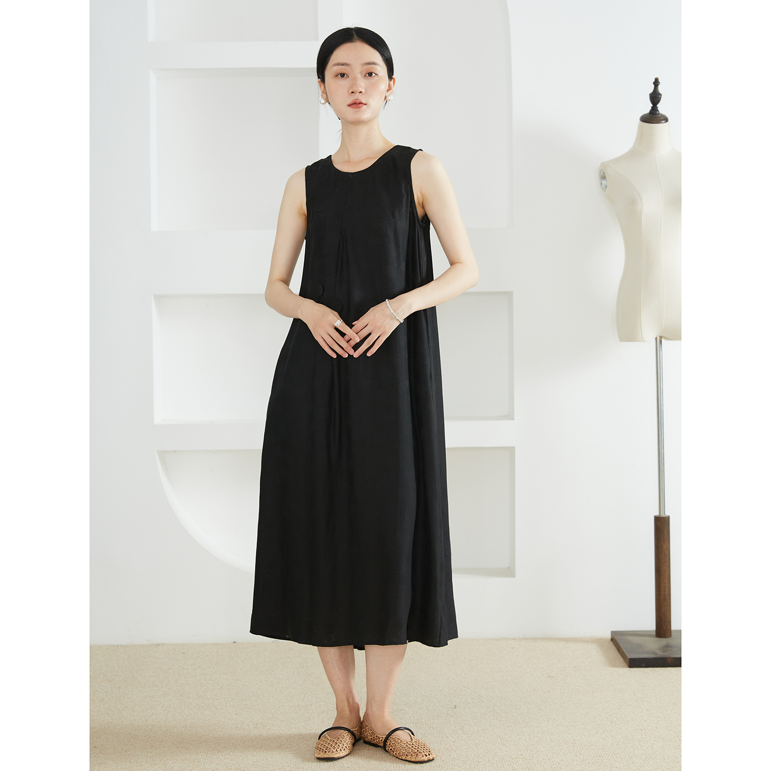 特惠 原创设计香云纱桑蚕丝背心长裙气质小黑裙真丝宽松长裙夏