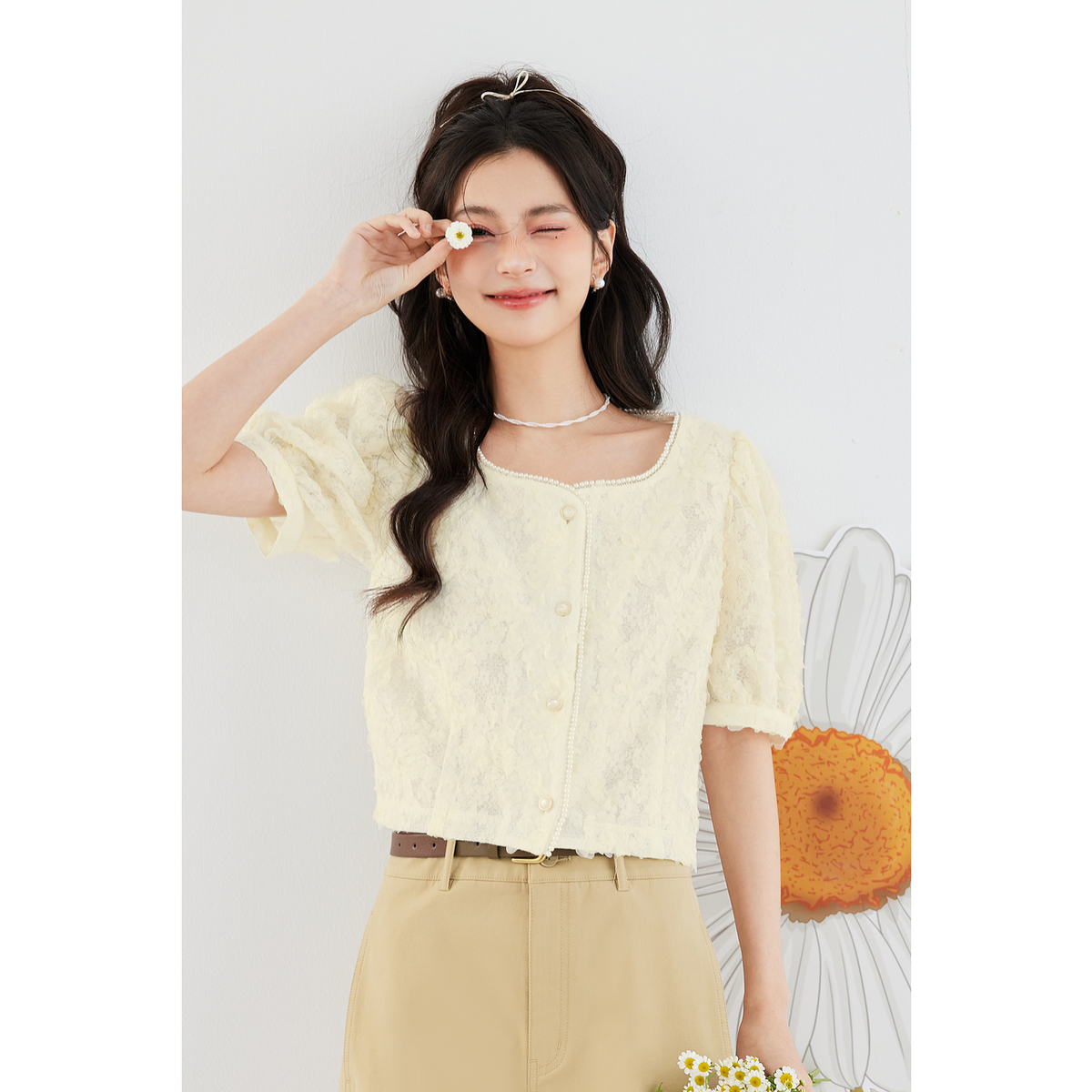 诗凡黎白色立体衬衫2024春夏新款流行小衫短款泡泡袖上衣