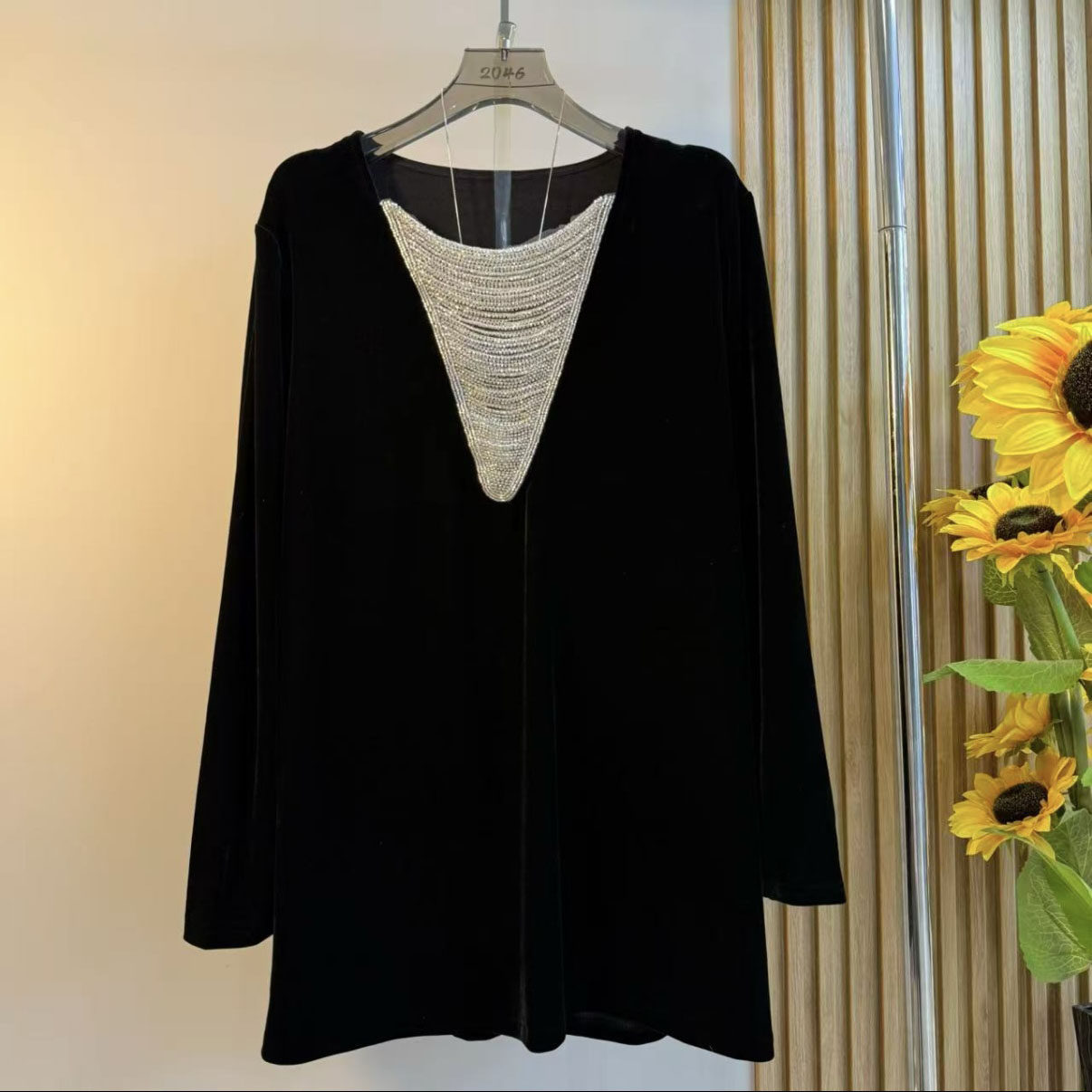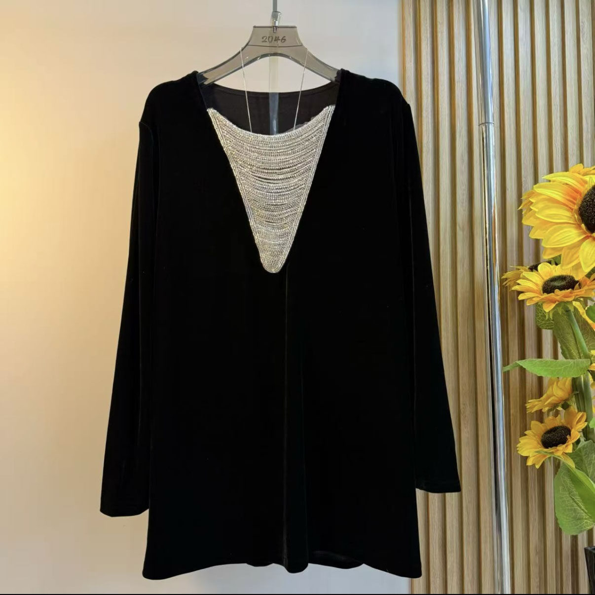 欧货大码女装2025秋冬新款时尚黑色显瘦气质串珠丝绒百搭打底衬衫