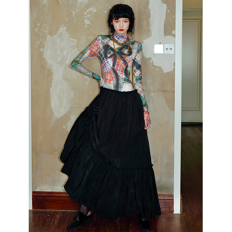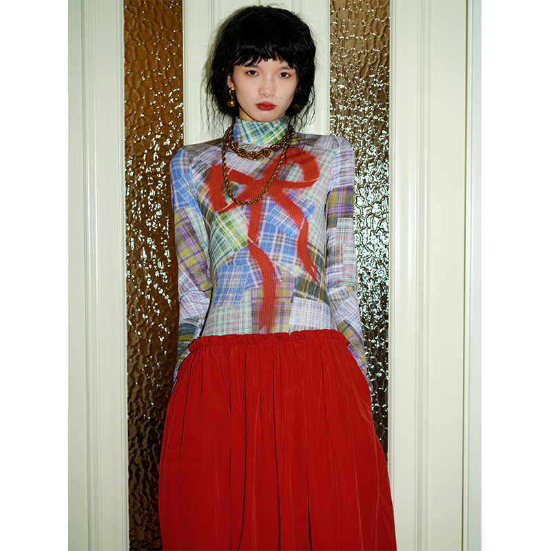 坏品味西部 蝴蝶结印花撞色拼接假两件设计春季长款连衣裙