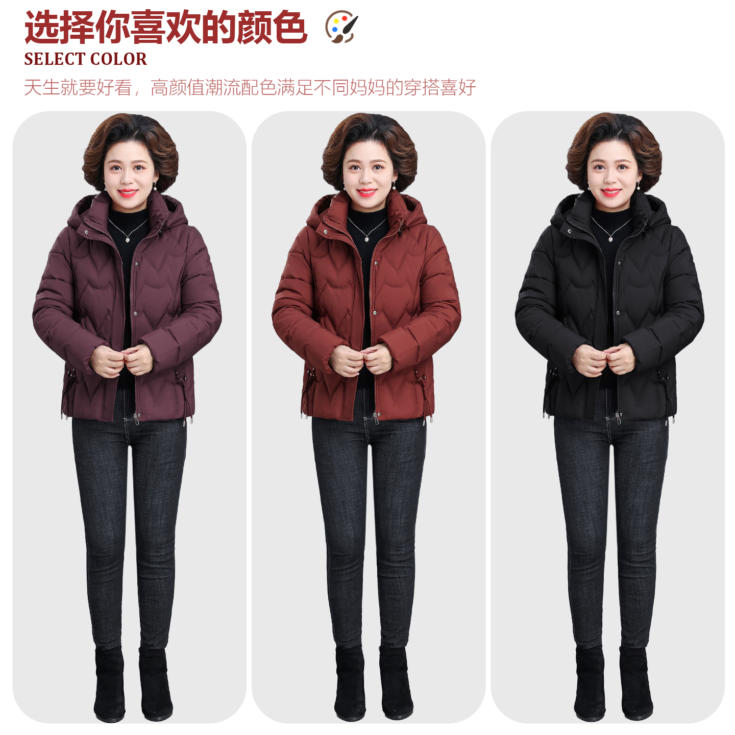 中年妈妈冬装棉服中老年女装秋冬时尚连帽外套羽绒棉衣中长款50岁