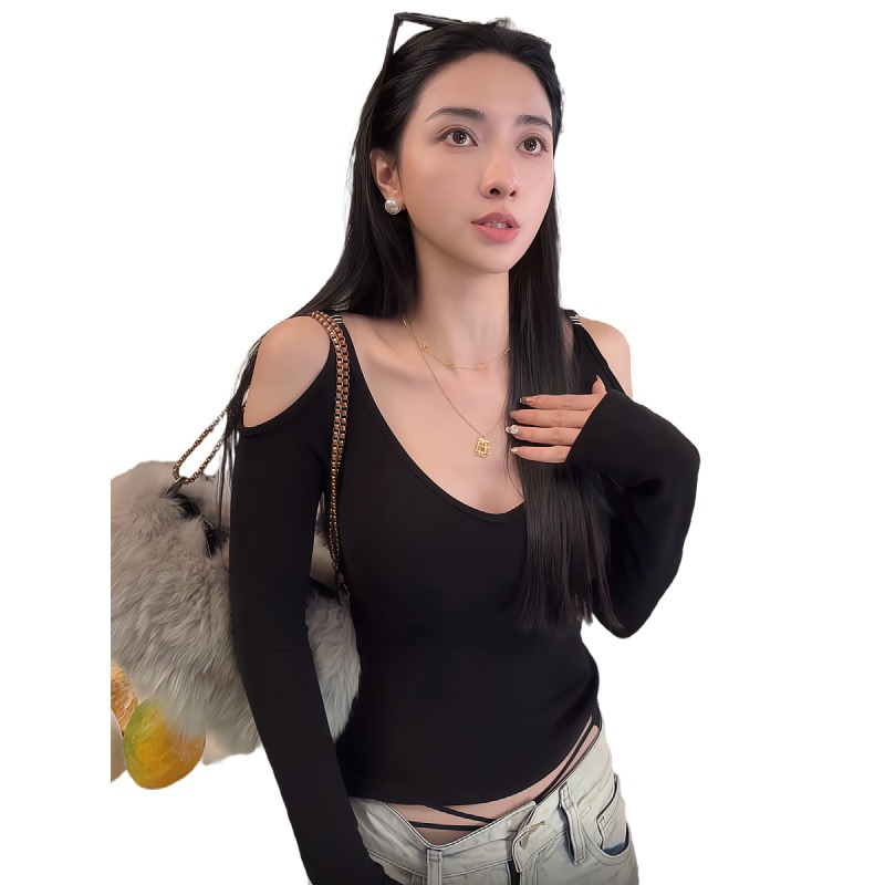 大码纯欲辣妹风露肩长袖T恤女秋季新款修身显瘦V领上衣内搭打底衫